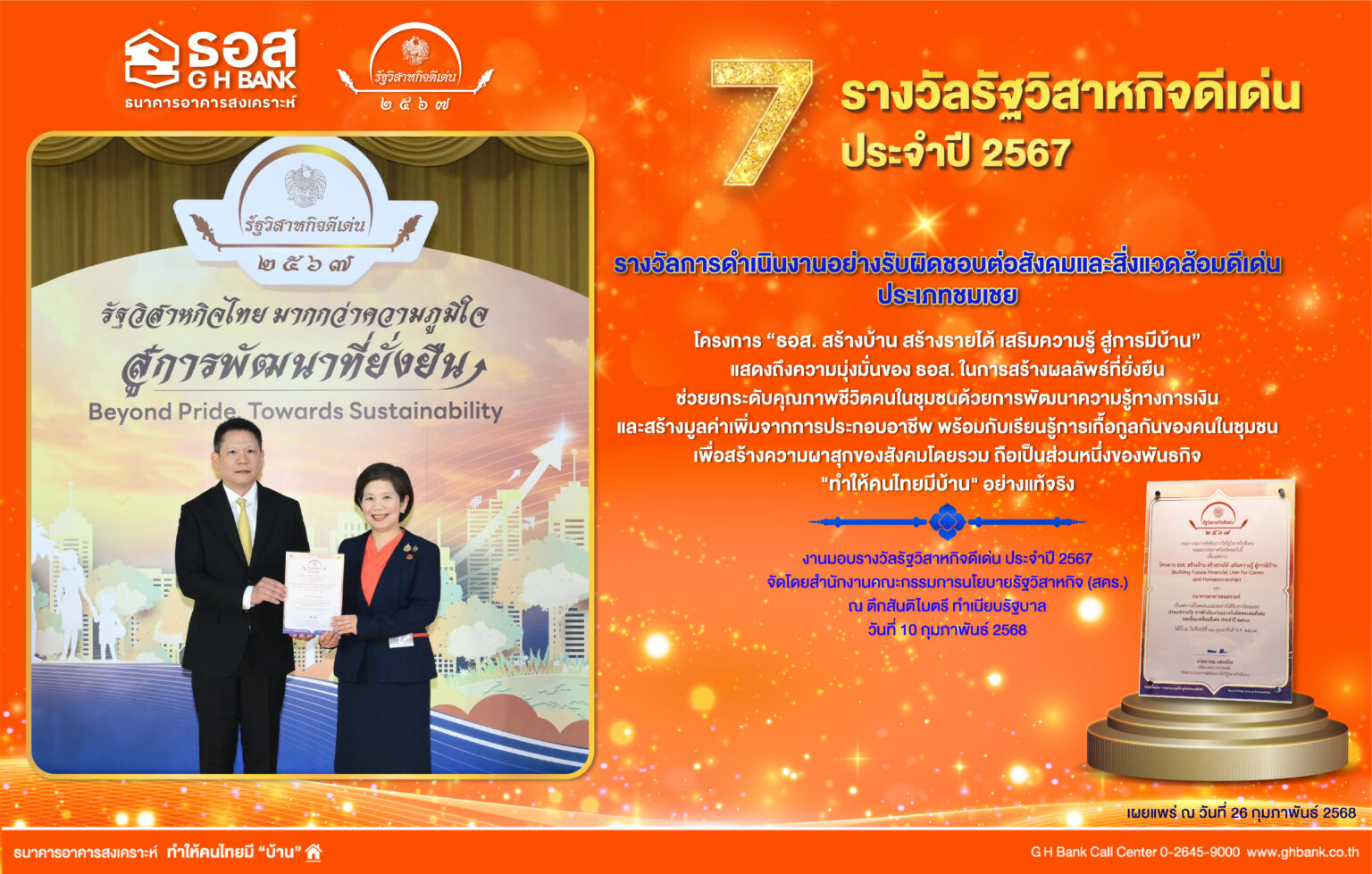 ทั้งที่เห็นผลทันทีและที่จะเกิดในระยะยาวต่อชุมชน ในระยะแรก ธอส.ยกระดับคุณภาพชีวิตความเป็นอยู่ของชุมชนด้วยการสร้างและซ่อมแซมที่อยู่อาศัยให้แก่ผู้ที่มีความเดือดร้อน ให้ความรู้ในการประกอบอาชีพ และต่อยอดด้วยโครงการให้ความรู้ทางการเงินสำหรับการประกอบกิจการและการวางแผนครัวเรือน และให้เงินทุนแก่ชุมชนสำหรับเป็นกองทุนกู้ยืมเพื่อซ่อมแซมที่อยู่อาศัย และมุ่งเน้นให้คนในชุมชนจะสามารถเข้าถึงแหล่งเงินทุน จากสถาบันทางการเงินในระบบได้ ตอบสนองพันธกิจของธนาคาร “ทำให้คนไทยมีบ้าน” โดยงานมอบรางวัลรัฐวิสาหกิจดีเด่น ประจำปี 2567 จัดโดยสำนักงานคณะกรรมการนโยบายรัฐวิสาหกิจ (สคร.) ณ ตึกสันติไมตรี ทำเนียบรัฐบาล เมื่อวันที่ 10 กุมภาพันธ์ 2568