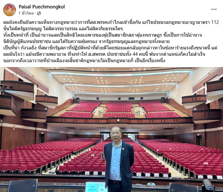 “เป็นที่น่ากังวลยิ่ง ที่สมาชิกรัฐสภาที่ปฏิบัติหน้าที่ด้วยดีโดยชอบ แต่กลับถูกกล่าวหาในข้อหาร้ายแรงถึงขนาดนี้ แต่ผมมั่นใจว่า แม้จะมีความพยายาม ที่จะทำให้ สส.พรรคประชาชนทั้ง 44 คนนี้ พ้นจากตำแหน่งก็คงไม่สำเร็จ นอกจากถึงเวลาวาระที่บ้านเมืองจะสิ้นชาติกฎหมายไม่เป็นกฎหมาย ก็เป็นอีกเรื่องหนึ่ง”..