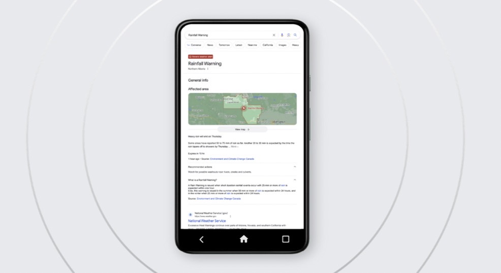 อีกทั้ง “Google Public Alerts” เป็นข้อมูลที่เตือนภัย ที่รวมใน “Google Search” และ “Google Maps” สิ่งที่พิเศษ คือ ไม่ต้องติดแอปพลิเคชันเพิ่มเติม และเป็นแหล่งอ้างอิงที่น่าเชื่อถือได้ พร้อมทั้งสามารถเตือนต่างๆ อาทิ แผ่นดินไหว สึนามิ พายุ ไฟป่า เมื่อมีเหตุการณ์เกิดขึ้นในพื้นที่ที่คุณอยู่ ข้อมูลนี้จะมาจากหน่วยงานรัฐบาลและองค์กรที่เกี่ยวข้อง