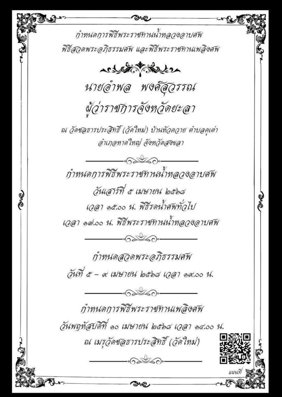 เมื่อวันที่ 3 เม.ย. 68 สำนักงานประชาสัมพันธ์จังหวัดยะลา ได้แจ้งข่าวการจากไปของ นายอำพล พงศ์สุวรรณ ผู้ว่าราชการจังหวัดยะลา และแจ้งกำหนดการพระราชทานน้ำหลวงอาบศพ