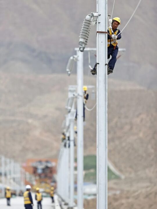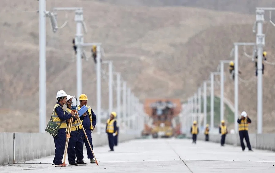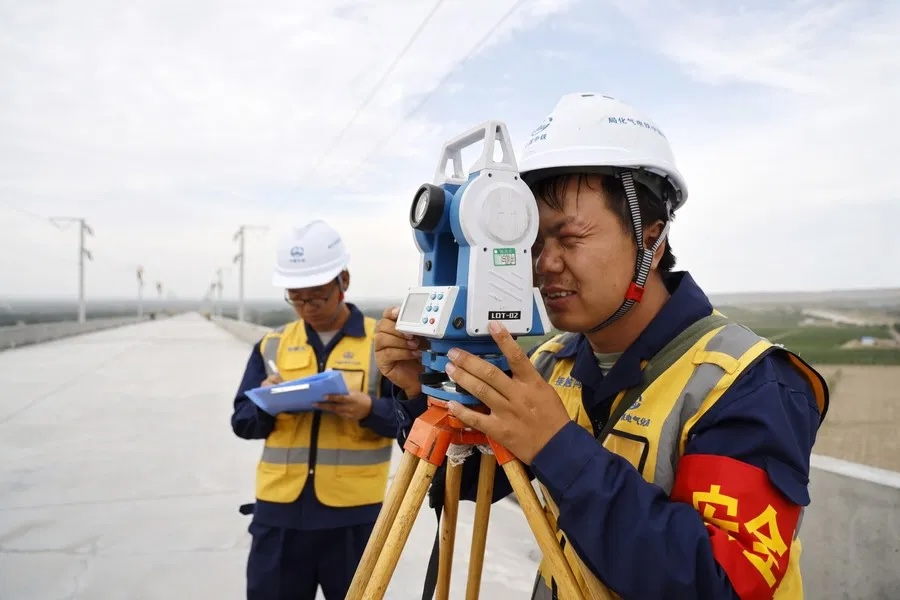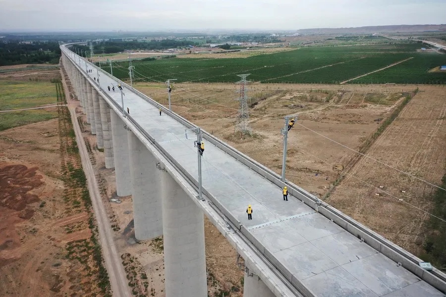 สำนักข่าวต่างประเทศรายงานจากเมืองอิ๋นชวน เขตปกครองตนเองหนิงเซี่ยหุย ประเทศจีน ว่า เมื่อวันที่ 12 ก.ค.เหล่าคนงานสาละวนกับการปฏิบัติงานบริเวณทางรถไฟความเร็วสูงสายจงเว่ย-หลานโจว ช่วงเมืองจงเว่ย เขตปกครองตนเองหนิงเซี่ยหุยทางตะวันตกเฉียงเหนือของจีน ซึ่งเข้าสู่ระยะการก่อสร้างระบบจ่ายไฟฟ้าเหนือศีรษะเมื่อไม่นานนี้