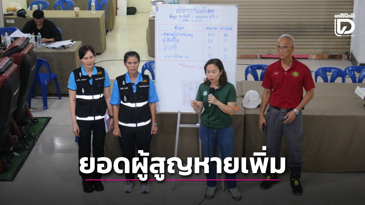 รศ.ทวิดา กล่าวว่า ตามที่ได้มีญาติผู้ประสบภัยแจ้งความตามหาบุคคลสูญหายไว้ที่ สน.บางซื่อ รวมถึงเจ้าหน้าที่ที่เกี่ยวข้องตรวจสอบข้อมูลกับบริษัทรับเหมาก่อสร้างพบผู้ประสบเหตุทั้งหมด 103 ราย ล่าสุด มีญาติของผู้สูญหายมาแจ้งเพิ่มเติมอีกจำนวนหนึ่ง ทำให้ตัวเลขของผู้ประสบภัยและตัวเลขของผู้สูญหายที่อยู่ระหว่างการติดตามเพิ่มขึ้น ซึ่งพนักงานสอบสวน สน.บางซื่อ และ กองพิสูจน์หลักฐานตำรวจได้สอบสวนยืนยันแล้ว เป็นจำนวน 6 ราย ทางกองอำนวยการร่วมจึงขอทำการปรับเปลี่ยนพร้อมประกาศผ่านสื่อมวลชน เพื่อให้เข้าใจตรงกัน ว่าขณะนี้ วันที่ 4 พ.ค. เวลา 12.00 น. จำนวนผู้ประสบเหตุ 109 ราย, ผู้เสียชีวิต 86 ราย (3 พ.ค. 18.00 น.), ผู้บาดเจ็บ คงที่ 9 ราย อยู่ระหว่างการติดตามอีก 14 ราย