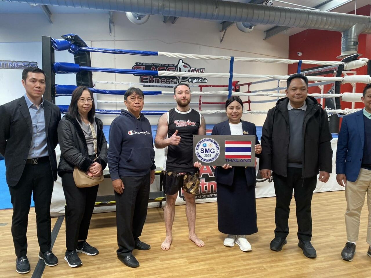 นางโปรดปราน สมานมิตร รองผู้ว่าการการกีฬาแห่งประเทศไทย ฝ่ายกีฬาอาชีพและกีฬามวย, นายปรีชา ลาลุน รองผู้ว่าการการกีฬาแห่งประเทศไทยฝ่ายกีฬาเป็นเลิศและวิทยาศาสตร์การกีฬา และนายณัฐพล อันตรเสน ผู้อำนวยการสำนักงานคณะกรรมการกีฬามวย ได้เดินทางไปเยี่ยมชมค่ายมวยในกรุงกลาสโกว์ ที่ผ่านเกณฑ์มาตรฐานจำนวน 10 ค่าย พร้อมทั้งได้มอบป้าย Standard Muaythai Gym หรือ SMG เพื่อเป็นการรับรองการผ่านมาตรฐานยิมมวยไทย