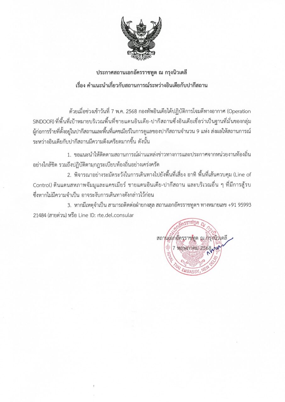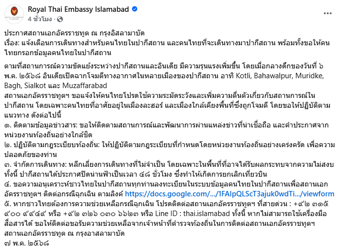 โดยระบุว่า ตามที่สถานการณ์ความขัดแย้งระหว่างปากีสถานและอินเดีย มีความรุนแรงเพิ่มขึ้น โดยเมื่อกลางดึกของวันที่ 6 พ.ค. 2568 อินเดียเปิดฉากโจมตีทางอากาศในหลายเมืองของปากีสถาน อาทิ Kotli, Bahawalpur, Muridke, Bagh, Sialkot และ Muzaffarabad สถานเอกอัครราชทูตฯ ขอแจ้งให้คนไทยโปรดใช้ความระมัดระวังและเพิ่มความตื่นตัวเกี่ยวกับสถานการณ์ในปากีสถาน โดยเฉพาะคนไทยที่อาศัยอยู่ในเมืองละฮอร์ และเมืองใกล้เคียงพื้นที่ซึ่งถูกโจมตี