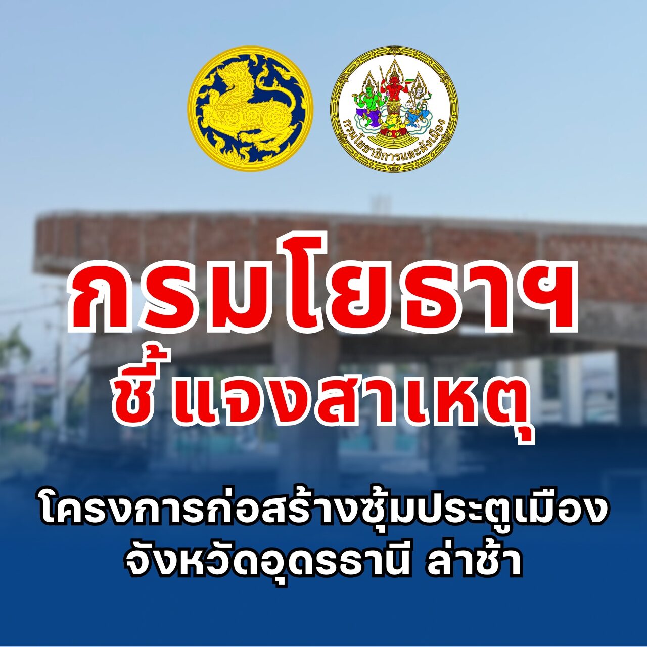 กรมโยธาธิการและผังเมือง ขอเรียนชี้แจงว่า โครงการดังกล่าว คือ โครงการก่อสร้างซุ้มประตูเมืองบริเวณถนนทหารหน้าค่ายประจักษ์ศิลปาคม ตำบลหมากแข้ง อำเภอเมืองอุดรธานี จังหวัดอุดรธานี โดยสาเหตุการล่าช้าเกิดจากการที่โครงการดังกล่าว มีการพักงานก่อสร้างทั้งหมด 3 ครั้ง เนื่องจาก (1) มณฑลทหารบกที่ 24 ขอให้ชะลอการส่งมอบพื้นที่ ในช่วงเดือนกุมภาพันธ์ 2565-เดือนมิถุนายน 2565 (2) มณฑลทหารบกที่ 24 ขอยกเลิกการอนุญาตใช้พื้นที่ก่อสร้าง ในช่วงเดือนกันยายน 2565-เดือนมกราคม 2566 และ (3) ในช่วงเดือนกรกฎาคม 2566 พบปัญหาแบบก่อสร้างบางส่วน ทำให้ต้องพักงานก่อสร้างบางส่วนและปรับแก้ไขแบบก่อสร้างให้สอดคล้องกับการใช้งาน และมีความคงทนในการใช้งานอย่างเหมาะสม ซึ่งปัจจุบันผู้รับจ้างกำลังดำเนินการก่อสร้างตามแบบที่แก้ไขใหม่ และได้รับการผ่อนผันให้ขยายระยะเวลาก่อสร้าง โดยการคิดค่าปรับในอัตราร้อยละ 0 ตามมาตรการให้ความช่วยเหลือผู้ประกอบการในช่วงการแพร่ระบาดของโรคติดเชื้อไวรัสโคโรนา 2019 ทั้งนี้ กรมฯ ได้ออกหนังสือเร่งรัดการก่อสร้าง และติดตามความก้าวหน้าอย่างใกล้ชิด เพื่อให้โครงการสามารถดำเนินการต่อไปได้อย่างมีประสิทธิภาพและแล้วเสร็จตามแผนงานโดยเร็วที่สุด