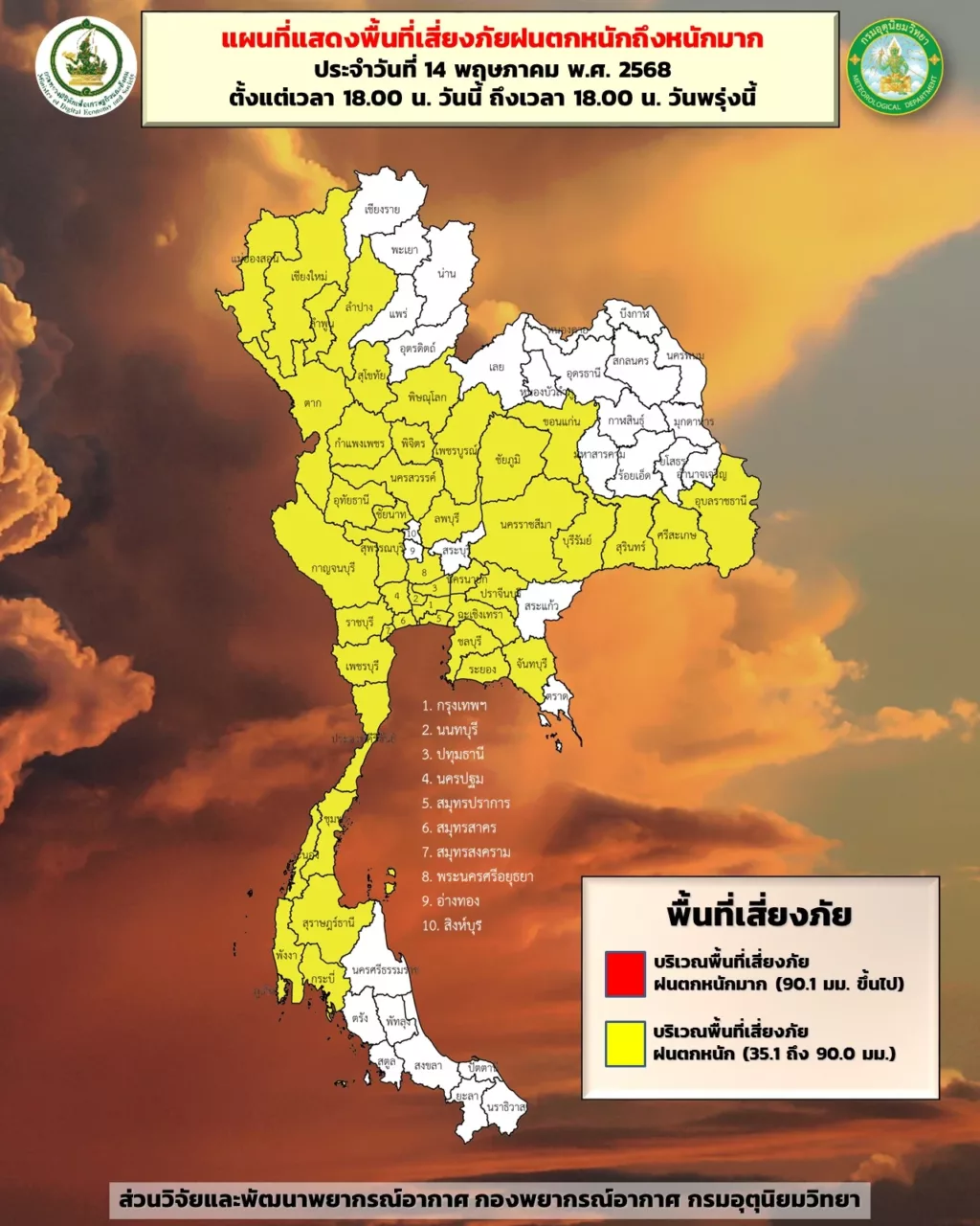 ล่าสุด กรมอุตุนิยมวิทยา พยากรณ์อากาศ 24 ชั่วโมงข้างหน้า ตั้งแต่เวลา 18.00 น. วันนี้ (14 พ.ค.) ถึง 18.00 น. ของวันที่ 15 พ.ค.