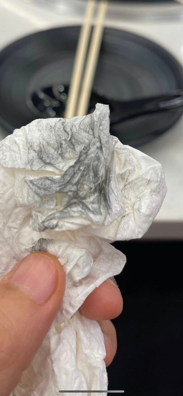 อีกทั้ง ในภาพจะเผยให้เห็นคราบสีดำติดออกมาจากเตา พร้อมน้ำมันสีดำไหลออกมาอย่างเห็นได้ชัด เจ้าตัวจึงได้ลองใช้กระดาษทิชชูเช็ดบริเวณเตา พบคราบสีดำติดออกมาตามภาพที่บันทึกไว้ จากนั้นได้แจ้งพนักงานและขอเปลี่ยนเตาใหม่ แต่เมื่อทดลองเช็ดเตาที่ยังไม่เปิดความร้อนต่อหน้าพนักงาน ก็ยังพบคราบสีดำลักษณะเดียวกัน จึงตัดสินใจยุติการทานและเช็กเอาต์ออกจากร้านทันที