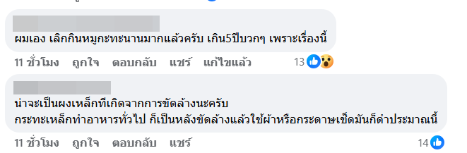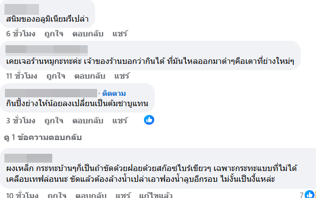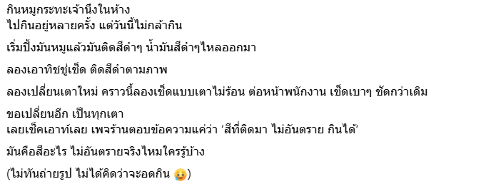 นอกจากนี้ “ขอเปลี่ยนอีกเป็นทุกเตา เลยเช็กเอาต์เลย เพจร้านตอบข้อความแค่ว่า “สีที่ติดมา ไม่อันตราย กินได้” มันคือสีอะไร ไม่อันตรายจริงไหมใครรู้บ้าง ไม่ทันถ่ายรูป ไม่ได้คิดว่าจะอดกิน”
