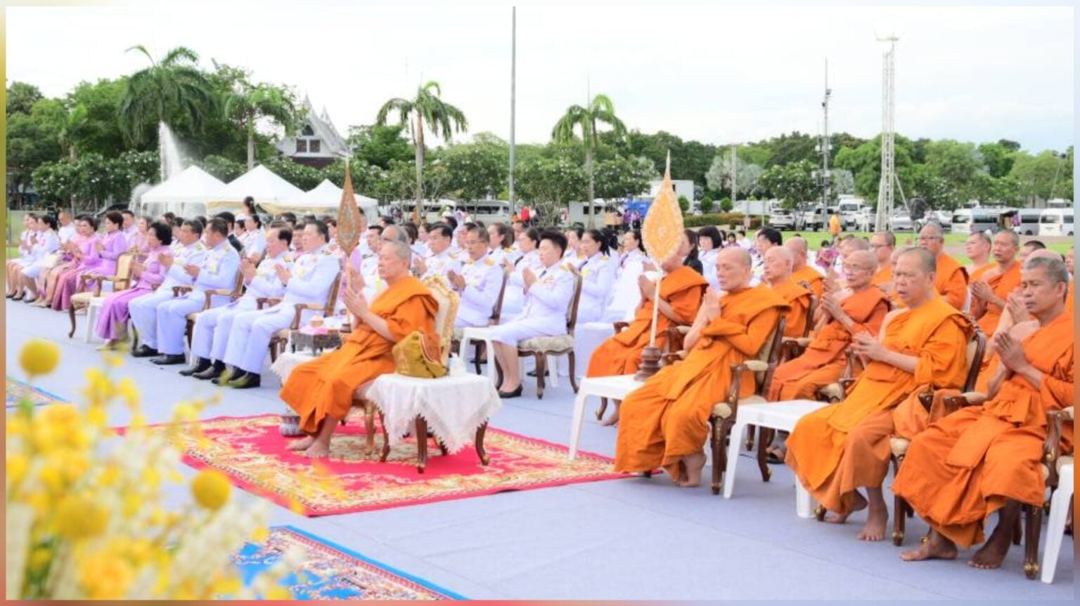 เมื่อเวลา 17.00 น. วันที่ 2 มิ.ย.ที่ลานองค์พระศรีศากยะทศพลญาณ ประธานพุทธมณฑลสุทรรศน์ พุทธมณฑล จ.นครปฐม สมเด็จพระมหารัชมงคลมุนี หรือ “สมเด็จธงชัย” ผู้ช่วยเจ้าอาวาสวัดไตรมิตรวิทยาราม กรรมการมหาเถรสมาคม (มส.) เจ้าคณะใหญ่หนกลาง เป็นประธานนำคณะสงฆ์และพระเกจิอาจารย์ในเขตปกครองคณะสงฆ์หนกลาง กว่า 2,000 รูป เจริญพระพุทธมนต์นวัคคหายุสมธัมม์ ถวายเป็นพระราชกุศลแด่สมเด็จพระนางเจ้าฯ พระบรมราชินี เนื่องในโอกาสวันเฉลิมพระชนมพรรษา 3 มิ.ย.2568