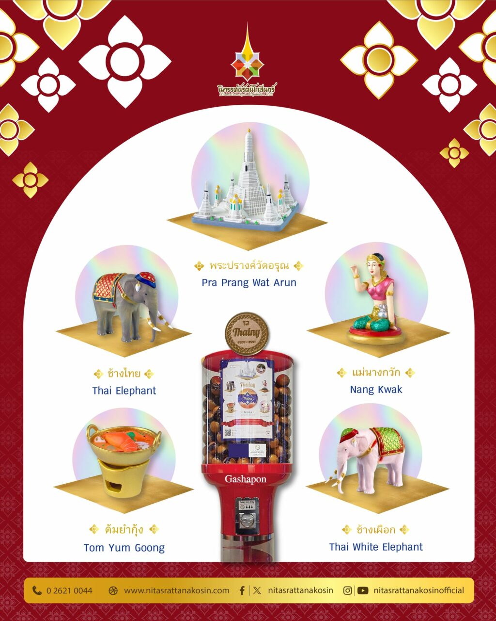 ซึ่งทำจากวัสดุเรซิ่น ทำสี แฮนด์เมด 100% ราคาสุ่มละ 200 บาท สามารถชมสินค้าได้ที่บริเวณเคาน์เตอร์จำหน่ายบัตรเข้าชมนิทรรศการนิทรรศน์รัตนโกสินทร์ นอกจากนี้ยังมีกาชาปองไทย Thai Miniature Figures Collection ที่ย่อส่วนความเป็นไทย ที่ระลึกร่วมสมัยของแผ่นดิน ออกแบบด้วยความประณีตทุกขั้นตอน เพื่อให้ได้รายละเอียดที่สมจริง สะท้อนถึงความงดงามของความเป็นไทยได้อย่างครบถ้วนสมบูรณ์ มีทั้งหมด 5 แบบ