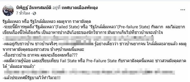 โดยนิพิฏฐ์ ระบุข้อความว่า “รัฐล้มเหลว หรือ รัฐใกล้ล้มเหลว ผมดูจากราคามังคุด ระยะนี้มีการพูดถึง “รัฐล้มเหลว” (Failed State) หรือ “รัฐใกล้ล้มเหลว” (Pre-failure State) กันมาก ผมไม่อยากเขียนเรื่องนี้ให้เถียงกัน เป็นอาหารปากอันโอชะของนักวิชาการ มันยากเกินไปที่ชาวบ้านจะเข้าใจ ผมอยู่กับชาวบ้าน ชาวบ้านจริงๆ”