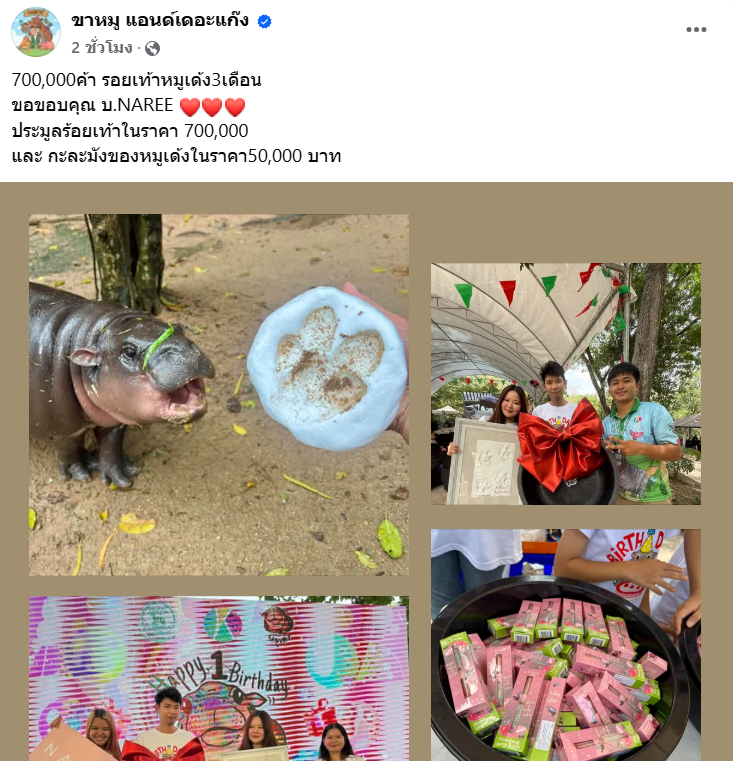 ต่อมาทางเพจเฟซบุ๊ก ขาหมู แอนด์เดอะแก๊ง ก็ได้ออกมาโพสต์สรุปยอดประมูลรอยเท้าของหมูเด้งตอน 3 เดือน ซึ่งปิดจบไปที่ 700,000 บาท พร้อมขอขอบคุณบริษัท NAREE ส่วนกะละมังของหมูเด้งปิดไปที่ราคา 50,000 บาทอีกด้วย…