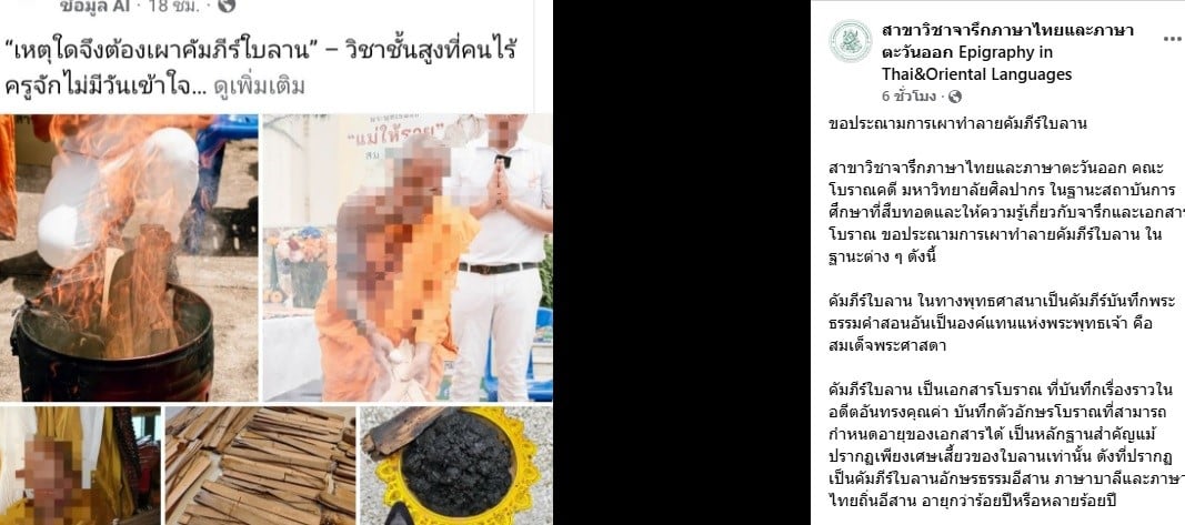 เพจเฟซบุ๊ก สาขาวิชาจารึกภาษาไทยและภาษาตะวันออก คณะโบราณคดี มหาวิทยาลัยศิลปากร ได้แชร์ภาพจากผู้ใช้เฟซบุ๊กรายหนึ่ง ซึ่งเป็นภาพกำลังเผาคัมภีร์ใบลานเพื่อนำไปเป็นมวลสารจัดสร้างวัตถุมงคลของวัดแห่งหนึ่ง พร้อมโพสต์ข้อความระบุว่า ในฐานะสถาบันการศึกษาที่สืบทอดและให้ความรู้เกี่ยวกับจารึกและเอกสารโบราณ ขอประณามการเผาทำลายคัมภีร์ใบลาน ในฐานะต่างๆ ดังนี้ คัมภีร์ใบลาน ในทางพุทธศาสนาเป็นคัมภีร์บันทึกพระธรรมคำสอนอันเป็นองค์แทนแห่งพระพุทธเจ้า คือสมเด็จพระศาสดา คัมภีร์ใบลาน เป็นเอกสารโบราณ ที่บันทึกเรื่องราวในอดีตอันทรงคุณค่า บันทึกตัวอักษรโบราณที่สามารถกำหนดอายุของเอกสารได้ เป็นหลักฐานสำคัญแม้ปรากฏเพียงเศษเสี้ยวของใบลานเท่านั้น ดังที่ปรากฏเป็นคัมภีร์ใบลานอักษรธรรมอีสาน ภาษาบาลีและภาษาไทยถิ่นอีสาน อายุกว่าร้อยปีหรือหลายร้อยปี
