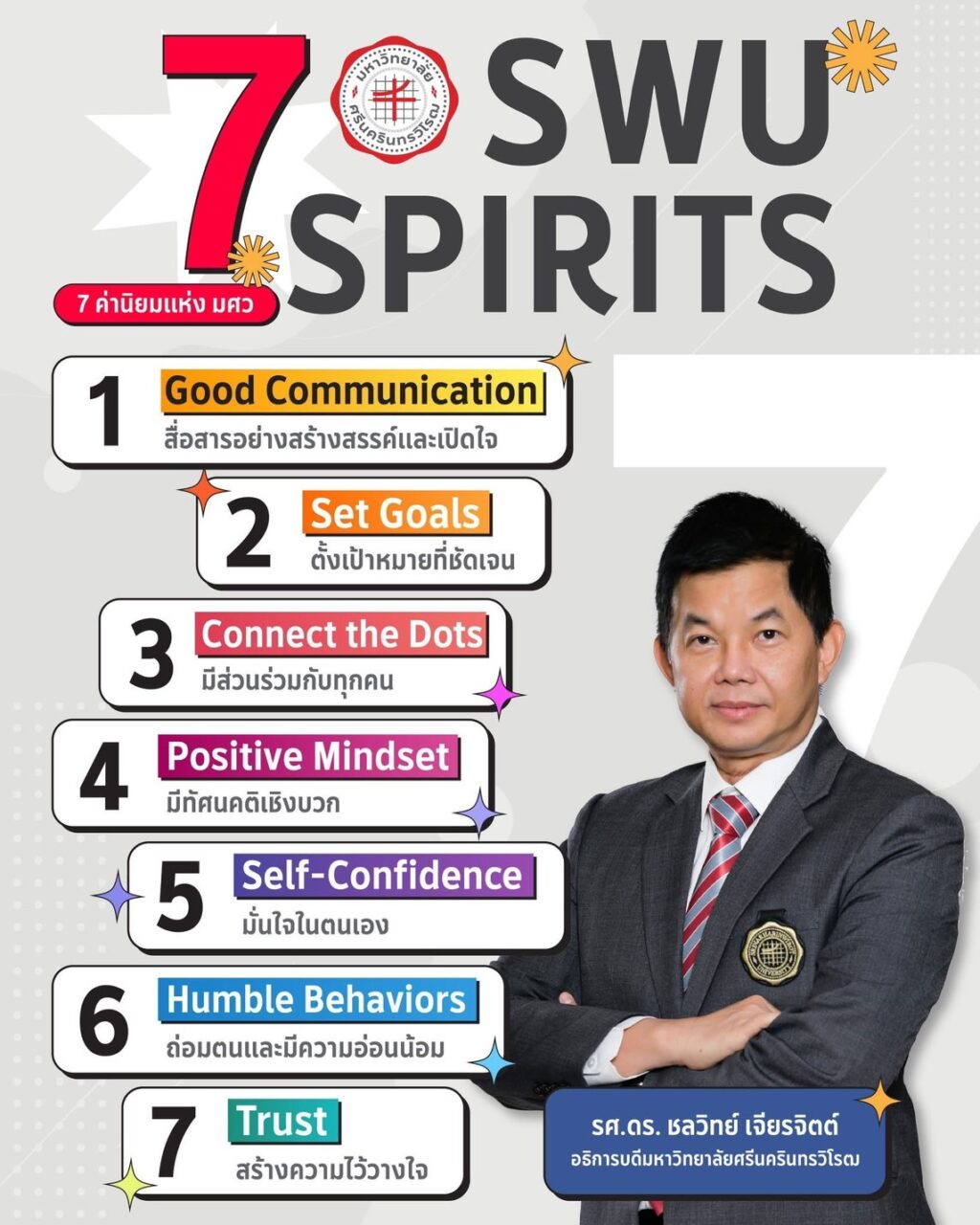 โดยรองศาสตราจารย์ ดร.ชลวิทย์ เจียรจิตต์ อธิการบดีมหาวิทยาลัยศรีนครินทรวิโรฒ (มศว) เปิดเผยว่า “มศว เป็นมหาวิทยาลัยอันดับหนึ่งในดวงใจของผมและผมก็อยากให้นิสิตใหม่ มศว วันนี้ได้ชื่อว่าเป็นเด็ก มศว ที่มีของดีถึง 7 อย่าง แบบที่ผมเรียกว่า 7 SWU Spirits เป็นความหวังของสังคมในวันข้างหน้าและมีความภูมิใจในความเป็นเด็ก มศว ได้แก่ มีการสื่อสารที่ดี Good Communication มีเป้าหมายชีวิตชัดเจนที่ดี Set Goals มีส่วนร่วมที่ดีกับทุกคน Connect the Dots คิดดี Positive Mindset มีทัศนคติเชิงบวก มีความมั่นใจที่ดี Self-Confidence มีความอ่อนน้อมถ่อมตนที่ดี Humble Behaviors