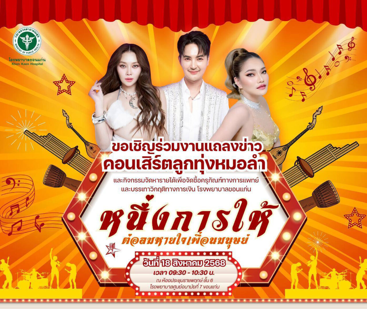 เมื่อเวลา 10.00 น.วันที่ 18 ส.ค. ที่ศูนย์อนามัยที่ 7 ขอนแก่น นายไกรสร กองฉลาด ผวจ.ขอนแก่น พร้อมด้วย นพ.สุรสิทธิ์ จิตรพิทักษ์ ผอ.รพ.ศูนย์ขอนแก่น และ นพ.ชาตรี เมธาธราธิป ผอ.ศูนย์อนามัยที่ 7 ขอนแก่น ร่วมแถลงข่าวการจัดคอนเสิร์ตลูกทุ่งหมอลำ “หนึ่งการให้ ต่อลมหายใจเพื่อนมนุษย์” ซึ่ง จังหวัดขอนแก่น ร่วมกับศูนน์อนามัยที่ 7 ขอนแก่น,หอการค้าจังหวัด,สภาอุตสาหกรรมการท่องเที่ยวจังหวัดรวมทั้งหน่วยงานภาครัฐและเอกชนในพื้นที่ จ.ขอนแก่น ได้กำหนดจัดกิจกรรมขึ้นเพื่อหารายได้ จัดซื้อครุภัณฑ์ทางการแพทย์และบรรเทาวิกฤติทางการเงิน รพ.ขอนแก่น โดยมีผู้นำองค์กรภาครัฐและเอกชนและภาคประชาชนในเขต จ.ขอนแก่นและจังหวัดใกล้เคียงรวมไปถึงศิลปิน นักร้อง นักแสดงและผู้แทนวงดนตรีหมอลำชื่อดังของไทยร่วมกิจกรรมอย่างพร้อมเพรียง
