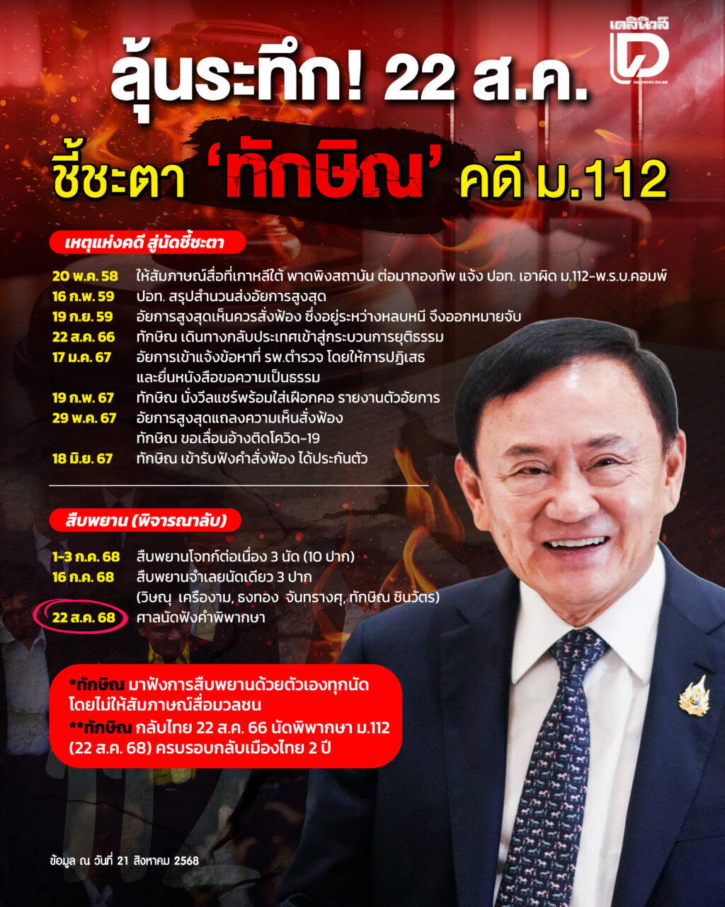 จนถึงวันพรุ่งนี้ที่ทางศาลอาญาได้นัดอ่านคำพิพากษา วันที่ 22 ส.ค. 68 เวลา 10.00 น. ซึ่งจะเป็นบทสรุปของเรื่องราวจะเป็นอย่างไร ก็ขอให้ประชาชนเฝ้าติดตามข่าวจากทางเดลินิวส์ต่อไป