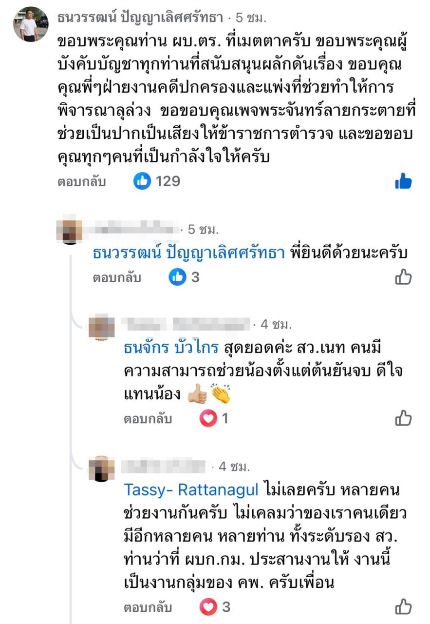 ขณะที่ ส.ต.อ.ธนวรรฒน์ ได้มาคอมเมนต์ ระบุว่า ขอบพระคุณท่าน ผบ.ตร. ที่เมตตาครับ ขอบพระคุณผู้บังคับบัญชาทุกท่านที่สนับสนุนผลักดันเรื่อง ขอบคุณคุณพี่ๆ ฝ่ายงานคดีปกครองและแพ่งที่ช่วยทำให้การพิจารณาลุล่วง ขอขอบคุณเพจพระจันทร์ลายกระต่าย ที่ช่วยเป็นปากเป็นเสียงให้ข้าราชการตำรวจ และขอขอบคุณทุกๆ คนที่เป็นกำลังใจให้ครับ