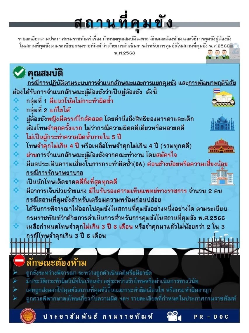 กรณีเมื่อวันที่ 6 ธ.ค.66 นายสหการณ์ เพ็ชรนรินทร์ อธิบดีกรมราชทัณฑ์ ได้ลงนามประกาศระเบียบกรมราชทัณฑ์ ว่าด้วยการดำเนินการสำหรับการคุมขังในสถานที่คุมขัง พ.ศ.2566 หรือระเบียบคุมขังนอกเรือนจำเพื่อพิจารณาให้ผู้ต้องขังที่เข้าเกณฑ์ ได้คุมขังยังสถานที่ที่ไม่ใช่เรือนจำ เพื่อลดความแออัดของเรือนจำ และเป็นการเตรียมความพร้อมก่อนปล่อย อีกทั้งกรมราชทัณฑ์ได้มีการเปิดรับฟังความคิดเห็นร่างประกาศกรมราชทัณฑ์ เรื่อง กำหนดคุณสมบัติเฉพาะ ลักษณะต้องห้ามและวิธีการคุมขังในสถานที่คุมขัง พ.ศ. 2566 พ.ศ. …. ผ่านระบบกลางทางกฎหมาย หรือผ่านทางเว็บไซต์ระบบกลางทางกฎหมาย www.law.go.th ระหว่างวันที่ 2 ธ.ค.67 – วันที่ 17 ธ.ค.67 เพื่อรวบรวมความคิดเห็นของประชาชนและทบทวนแก้ไขให้เหมาะสม กระทั่งวันที่ 25 มี.ค.68 กรมราชทัณฑ์ ได้อัปโหลดไฟล์เอกสาร “ประกาศกรมราชทัณฑ์ เรื่อง กำหนดคุณสมบัติเฉพาะ ลักษณะต้องห้าม และวิธีการคุมขังผู้ต้องขังในสถานที่คุมขัง ตามระเบียบกรมราชทัณฑ์ ว่าด้วยการดำเนินการสำหรับการคุมขังในสถานที่คุมขัง พ.ศ. 2566 พ.ศ. 2568“ ซึ่งท้ายเอกสารได้มีการลงนามโดย นายสหการณ์ เพ็ชรนรินทร์ อธิบดีกรมราชทัณฑ์ ประกาศ ณ วันที่ 19 มี.ค.68 ตามที่มีการรายงานข่าวไปแล้วนั้น