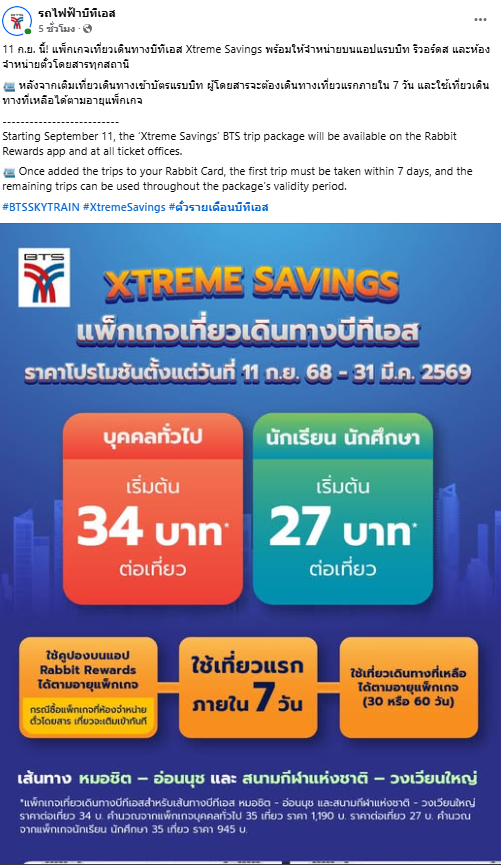โดยแฟนเพจรถไฟฟ้าบีทีเอส ระบุข้อความว่า “11 ก.ย. นี้ แพ็กเกจเที่ยวเดินทางบีทีเอส Xtreme Savings พร้อมให้จำหน่ายบนแอปแรบบิท รีวอร์ดส และห้องจำหน่ายตั๋วโดยสารทุกสถานี”