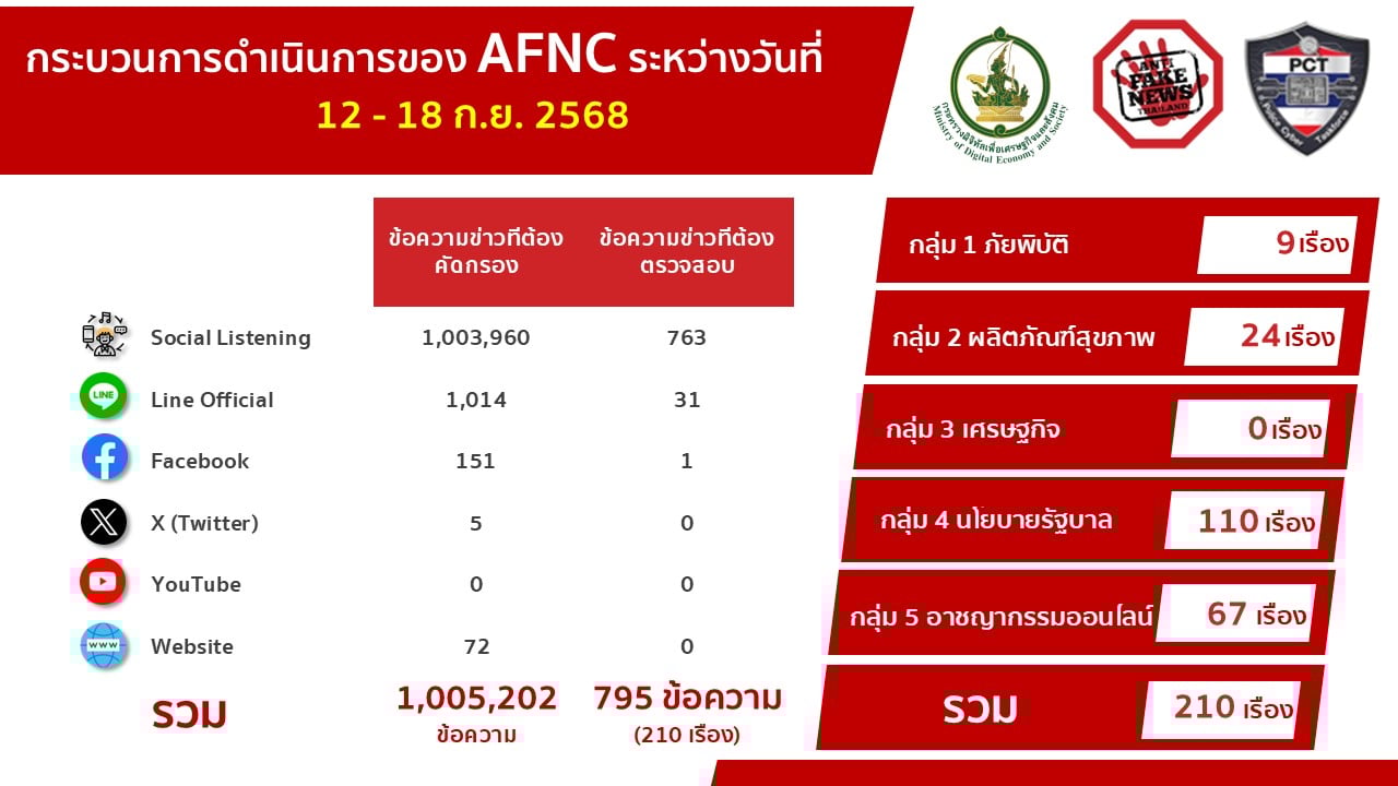 นายเวทางค์ พ่วงทรัพย์ เลขาธิการคณะกรรมการดิจิทัลเพื่อเศรษฐกิจและสังคมแห่งชาติ (BDE) ในฐานะโฆษกกระทรวงดิจิทัลเพื่อเศรษฐกิจและสังคม (ดีอี) กล่าวถึงผลการมอนิเตอร์และรับแจ้งข่าวปลอมของศูนย์ต่อต้านข่าวปลอม ระหว่างวันที่ 12 – 18 กันยายน 2568 พบข้อความที่เข้ามาทั้งหมด 1,005,202 ข้อความ โดยมีข้อความที่ต้องดำเนินการตรวจสอบ (Verify) ทั้งสิ้น 795 ข้อความ สำหรับช่องทางที่มีการพบเบาะแสมากที่สุด คือ ข้อความที่มาจาก Social Listening จำนวน 763 ข้อความ ตามมาด้วยการแจ้งเบาะแสผ่าน Line Official จำนวน 31 ข้อความ และช่องทาง Facebook จำนวน 1 ข้อความ รวมเรื่องที่ต้องดำเนินการตรวจสอบทั้งหมด 210 เรื่อง และจากการประสานงานกับหน่วยงานที่เกี่ยวข้อง ได้รับผลการตรวจสอบกลับมาแล้ว 91 เรื่อง