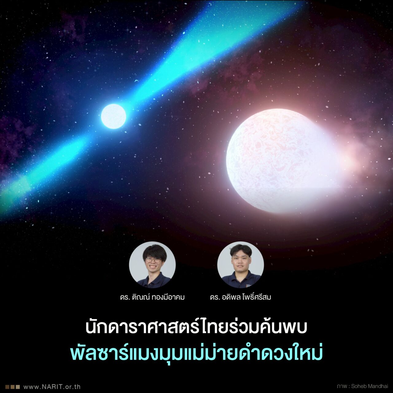 เมื่อวันที่ 25 ก.ย.68 สถาบันวิจัยดาราศาสตร์แห่งชาติ (องค์การมหาชน) (สดร. หรือ NARIT) กระทรวงการอุดมศึกษา วิทยาศาสตร์ วิจัยและนวัตกรรม (อว.) เปิดเผยว่ามี 2 นักดาราศาสตร์ไทยร่วมทีมวิจัยนานาชาติค้นพบพัลซาร์แมงมุมแม่ม่ายดำดวงใหม่ PSR J1544–2555 เป้าหมายใหม่สำหรับการศึกษาด้านฟิสิกส์ ช่วยให้เข้าใจระบบดวงคู่ และวิวัฒนาการของพัลซาร์มากยิ่งขึ้น งานวิจัยดังกล่าวตีพิมพ์ลงในวารสาร Monthly Notices of the Royal Astronomical Society เมื่อวันที่ 16 กันยายน 2568 ที่ผ่านมา