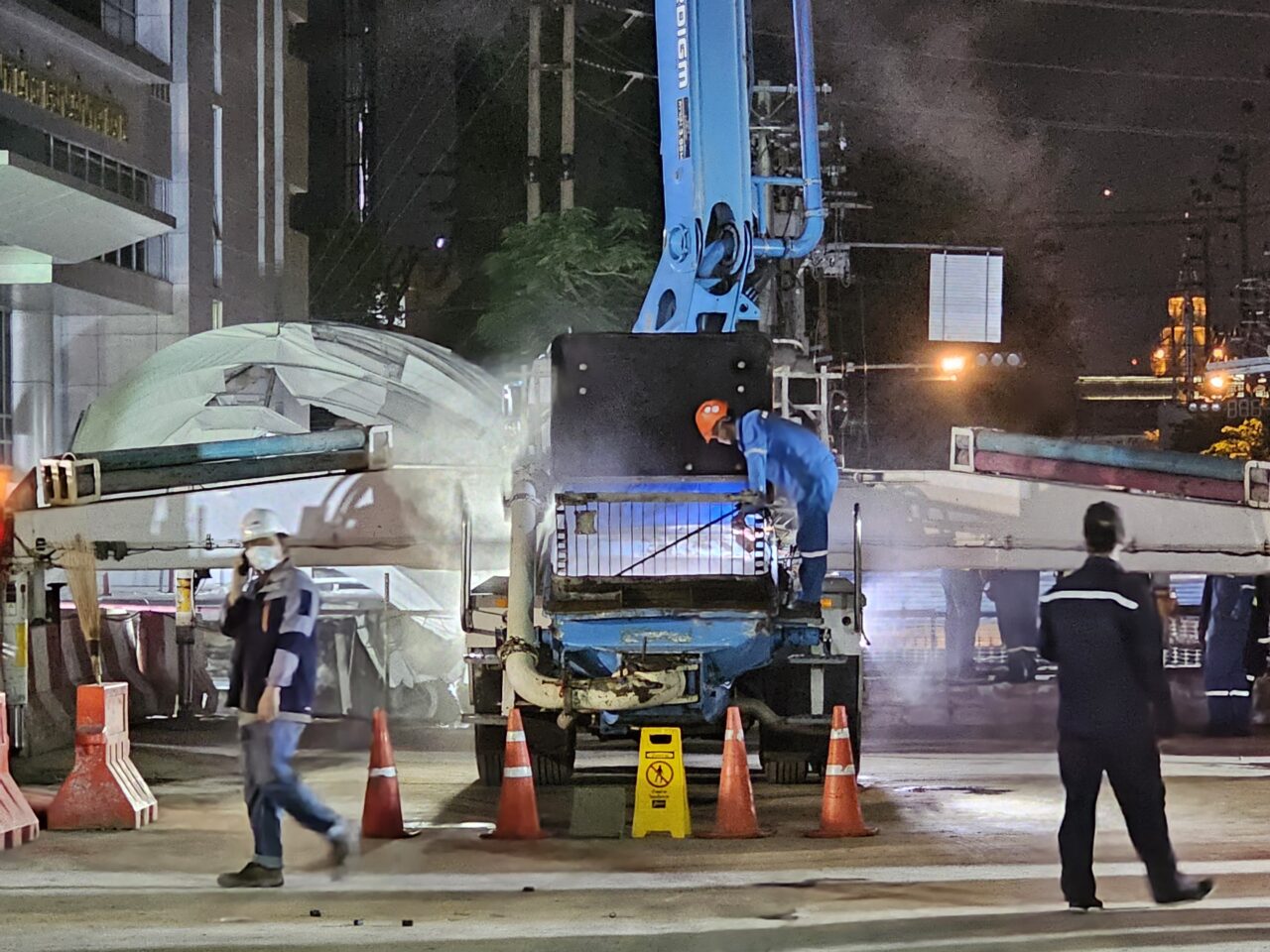 โดย นายกาจผจญ เปิดเผยว่า ค่ำคืนนี้จะมีการเทคอนกรีตลงไปในหลุมลึกอีกประมาณ 100 ถึง 150 คิว โดยใช้ท่อต่อลงไปให้ถึงพื้นด้านล่าง เพื่อให้ปูนลงไปในจุดที่มีช่องโหว่ ซึ่งคาดว่าจะเสร็จประมาณเที่ยงคืนนี้จะมีการเทคอนกรีตอีกครั้งช่วงเช้าวันพรุ่งนี้ ส่วนช่วงบ่ายจะพักเพื่อให้ปูนเซ็ตตัว จากนั้นวันอาทิตย์จะเก็บเศษวัสดุที่อยู่ภายในดินด้านล่าง โดยได้รับการอนุเคราะห์จากกรุงเทพมหานคร ในเรื่องการทำปั๊มระบายน้ำ หากมีฝนตกลงมาในพื้นที่