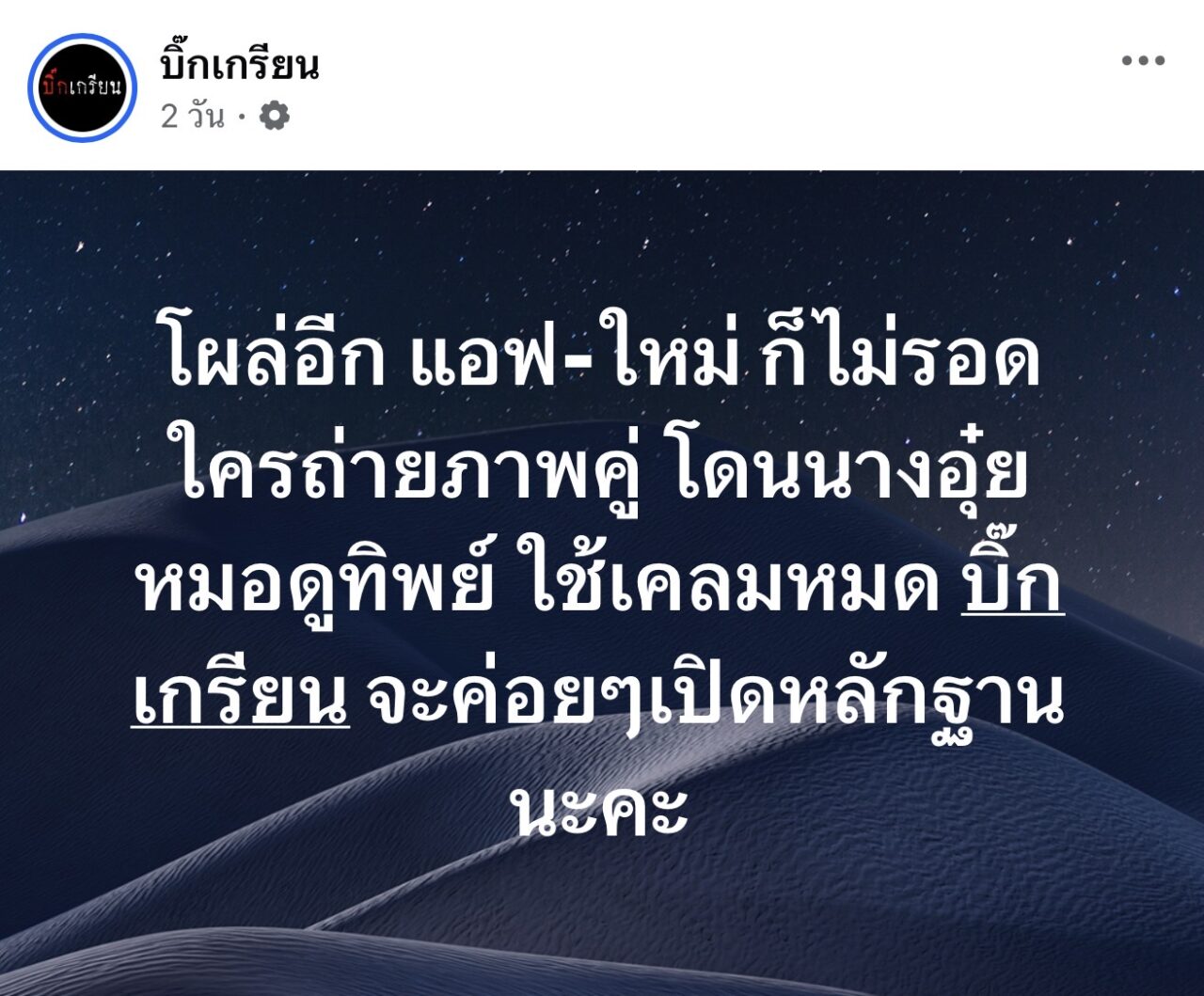 โดยเพจดังระบุข้อความเดือดๆ ว่า “โผล่อีก แอฟ-ใหม่ ก็ไม่รอด ใครถ่ายภาพคู่ โดนนางอุ๋ยหมอดูทิพย์ ใช้เคลมหมด บิ๊กเกรียน จะค่อยๆเปิดหลักฐานนะคะ” พร้อมนำแชตหลักฐานมาประกอบใต้โพสต์ทันที