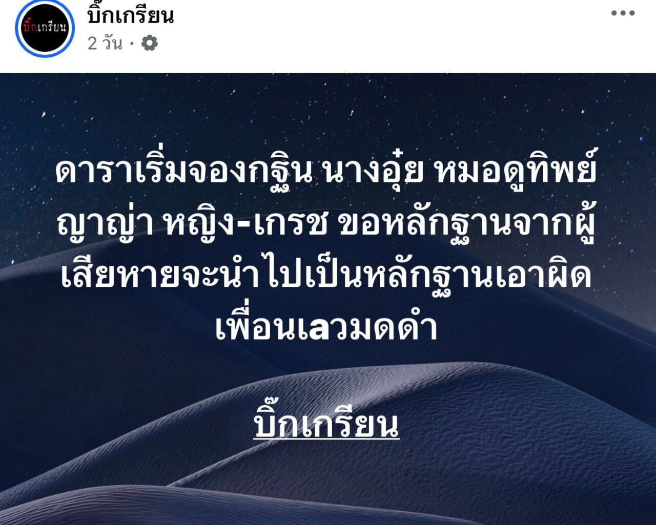 เท่านั้นยังไม่พอ เพจดังยังโพสต์อีกหนึ่งความเคลื่อนไหวล่าสุดที่สะเทือนวงการ โดยเผยว่าบรรดาเพื่อนร่วมวงการเริ่มจองกฐิน ไม่ยอมทนอยู่เฉยๆ แล้ว โดยโพสต์ดังกล่าวระบุว่า “ดาราเริ่มจองกฐิน นางอุ๋ย หมอดูทิพย์ ญาญ่า หญิง (หญิง รฐา)–เกรซ (เกรซ กาญจน์เกล้า) ขอหลักฐานจากผู้เสียหายจะนำไปเป็นหลักฐานเอาผิดเพื่อนเaวมดดำ บิ๊กเกรียน”