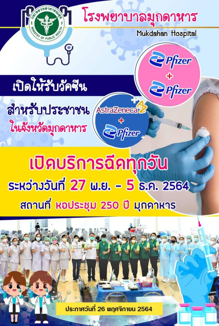 เมื่อวันที่ 27 พ.ย. นพ.ปิยะพงษ์ มากนวล รองผู้อำนวยการด้านสารสนเทศ รพ.มุกดาหาร เปิดเผยว่า ขอเชิญชวนพี่น้องชาว จ.มุกดาหาร มารับวัคซีน ขณะนี้รณรงค์ให้วัคซีน Pfizer เข็ม 1 และ Pfizer เข็ม 2 ตั้งแต่วันที่ 27 พ.ย.-5 ธ.ค.64 เพื่อพ่อของเราและประชาชนชาว จ.มุกดาหาร จะได้มีภูมิคุ้มกันและเศรษฐกิจเจริญรุ่งเรือง เข้ามารับบริการได้ที่หอประชุม 250 ปี จ.มุกดาหาร เวลา 08.00-16.00 น. ของทุกวัน