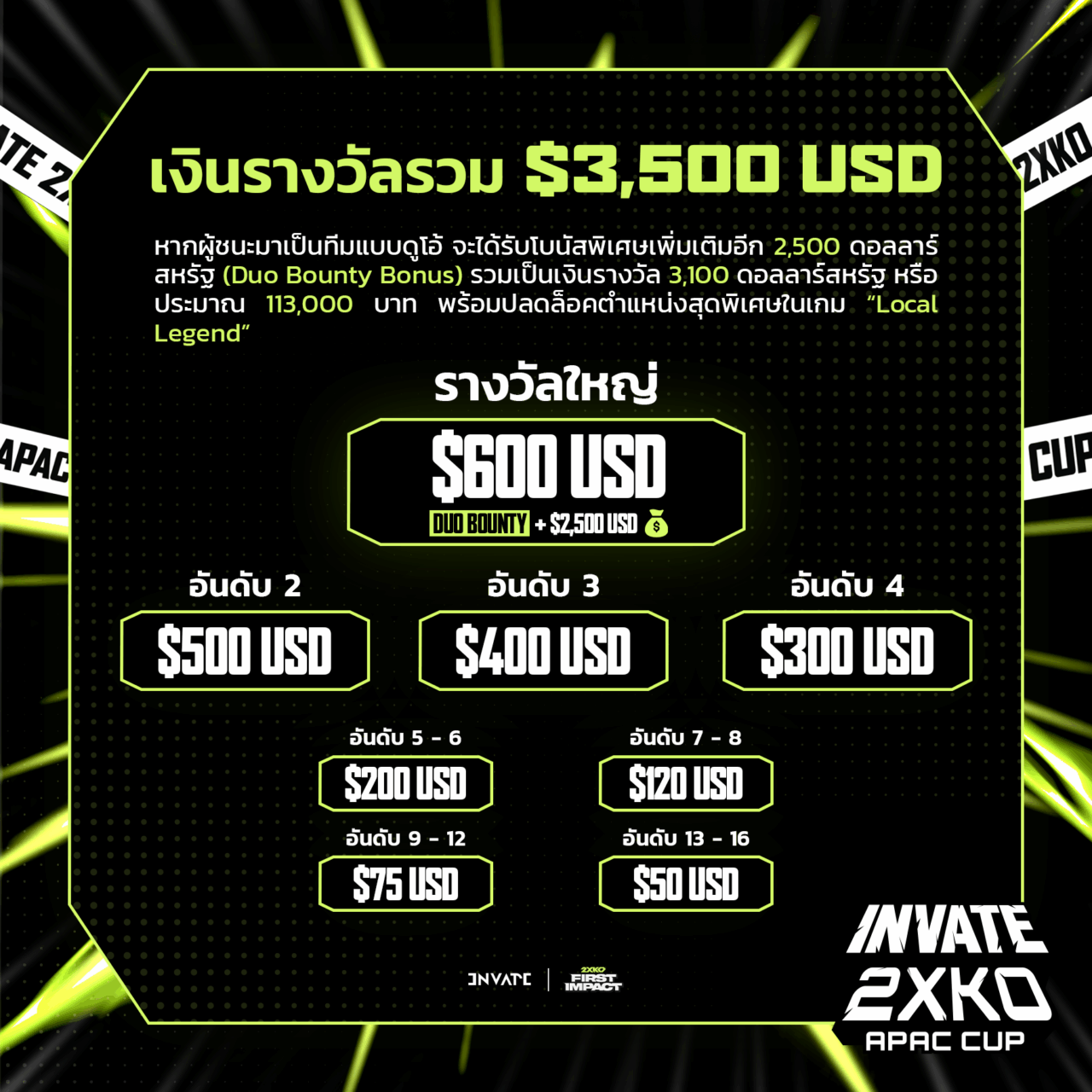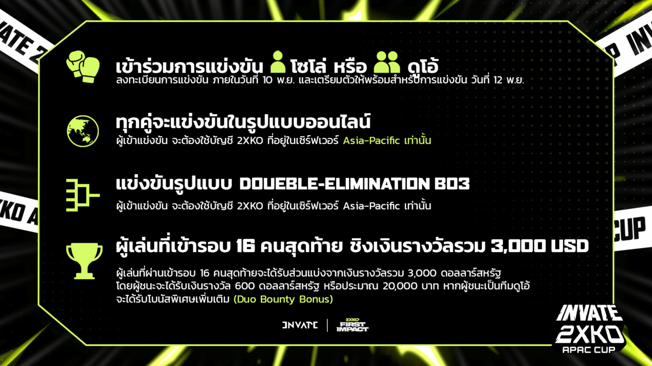 Riot Games เดินหน้าสนับสนุนคอมมูนิตี้สายต่อสู้ไทยอย่างเต็มกำลัง! จัดการแข่งขัน “INVATE 2XKO APAC Cup” ทัวร์นาเมนต์ออนไลน์ครั้งแรกในประเทศไทยและภูมิภาคเอเชียแปซิฟิก (APAC) โดยจับมือกับพาร์ทเนอร์อย่าง Invate เพื่อเปิดโอกาสให้เหล่านักสู้ชาวไทยได้แสดงฝีมือบนเวทีใหญ่ พร้อมชิงเงินรางวัลรวมกว่า 3,000 ดอลลาร์สหรัฐ (ประมาณ 100,000 บาท) และโอกาสคว้าตำแหน่งสุดพิเศษในเกม “Local Legend”