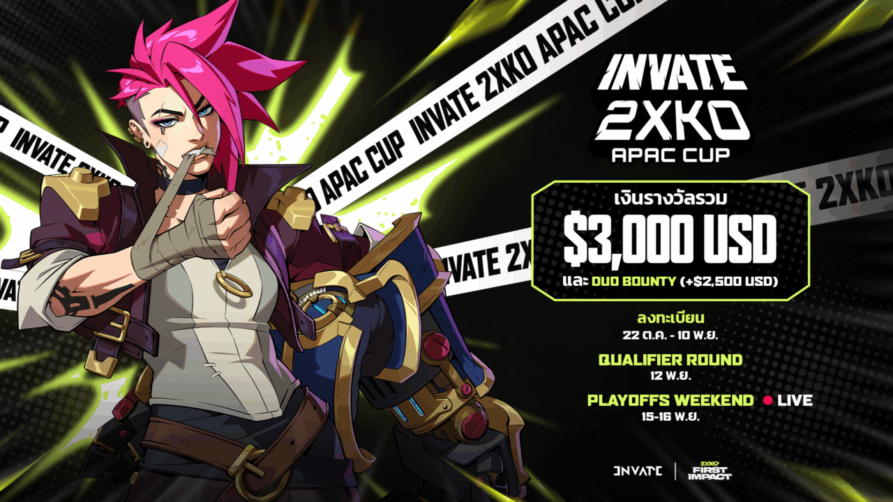 Riot Games เดินหน้าเปิดการแข่งขันเกม 2XKO ด้วยการส่ง “INVATE 2XKO APAC Cup” ชิงเงินรางวัลรวมกว่า 100,000 บาท จุดไฟนักสู้ไทยสู่เวทีระดับภูมิภาค สมัครได้ตั้งแต่วันนี้ ถึงวันที่ 10 พ.ย. เท่านั้น!
