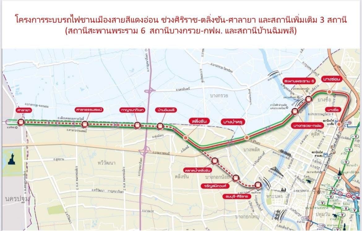 และโครงการระบบรถไฟชานเมืองสายสีแดงอ่อน ช่วงศิริราช-ตลิ่งชัน-ศาลายา และสถานีเพิ่มเติม 3 สถานี (สถานีสะพานพระราม 6 สถานีบางกรวย-กฟผ. และสถานีบ้านฉิมพลี) ระยะทาง 20.05 กม. วงเงิน 14,729,700,000 บาท
