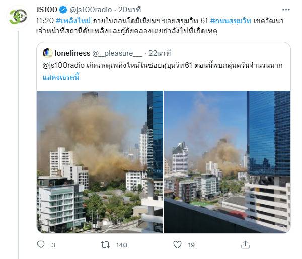 เมื่อวันที่ 3 ธ.ค. ผู้สื่อข่าวรายงานว่า ทวิตเตอร์ จส.100 ได้รีทวีตผู้ใช้ทวิตเตอร์ “loneliness” พบเหตุเพลิงไหม้ภายในคอนโดมิเนียมหรูแห่งหนึ่งสูงชั้น 8 ภายในซอยสุขุมวิท 61 ถนนสุขุมวิท แขวงคลองตันเหนือ เขตวัฒนา กทม. โดยพบกลุ่มควันเป็นจำนวนมาก ซึ่งเจ้าหน้าที่สำนักป้องกันและบรรเทาสาธารณภัยกำลังรุดไปตรวจสอบที่เกิดเหตุ เบื้องต้นยังไม่ทราบสาเหตุที่แน่ชัด หากมีความคืบหน้าจะรายงานเพิ่มเติมต่อไป.