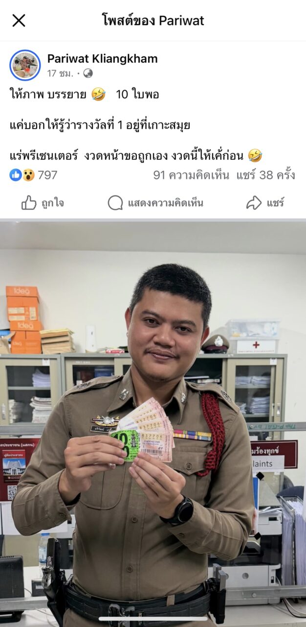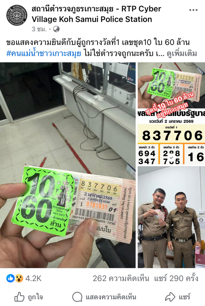 เมื่อวันที่ 3 ม.ค. ผู้สื่อข่าวรายงานว่า เพจเฟซบุ๊ก สถานีตำรวจภูธรเกาะสมุย-RTP Cyber Village Koh Samui Police Station ได้โพสต์ข้อความ ขอแสดงความยินดีกับผู้ถูกรางวัลที่ 1 เลขชุด 10 ใบ 60 ล้านบาท และติดแฮชแท็ก คนแม่น้ำชาวเกาะสมุย ไม่ใช่ตำรวจถูกนะครับ เขามาลงประจำวันไว้เป็นหลักฐาน และแฮชแท็ก ขอจับสักนิดเพื่อเอาฤกษ์ พร้อมภาพสลากกินแบ่งรัฐบาล ประวันงวดวันที่ 2 มกราคม 2569 เลข 837706 และมีนายตำรวจในเครื่องแบบ 2 นาย ถือสลากโชว์