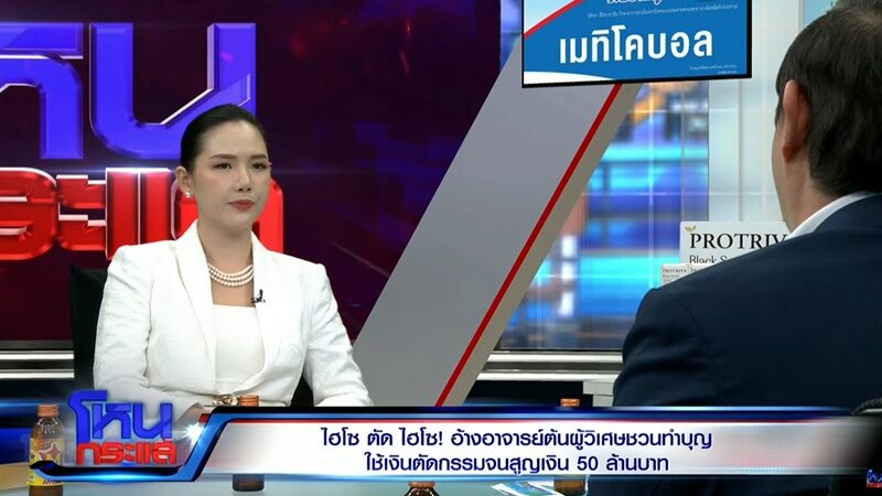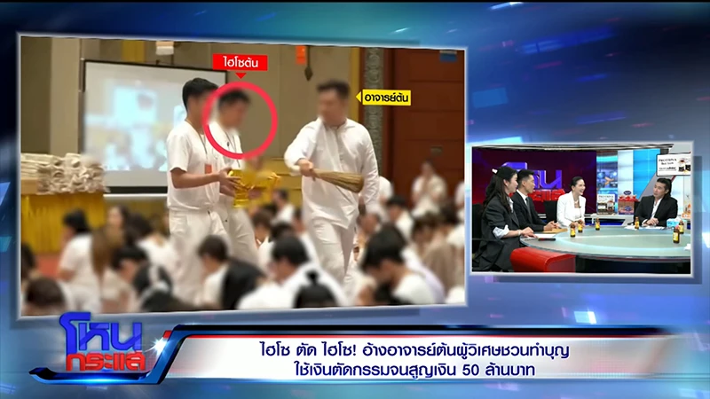 สั่นสะเทือนวงการไฮโซ 2 สาวคนดัง “มัดหมี่ พิมดาว” และ “ดาต้า ดรัลชรัส” ควงแขนผู้เสียหาย “คุณขวัญ ม.ล.พลอยนภัส” เปิดใจกลางรายการโหนกระแส แฉกลลวงสำนักปฏิบัติธรรมลวงโลก “อาจารย์ต้น ผู้วิเศษ” หลังหลงเชื่อยอมเปย์เงินลดละกรรมจนสูญเงินรวมกันกว่า 58 ล้านบาท ขณะที่คุณขวัญโดนเพื่อนรัก “ไฮโซต้น” ยืมแล้วชิ่งหนีไปอเมริกากว่า 14 ล้านบาท รวมมูลค่าความเสียหายพุ่ง 72 ล้าน