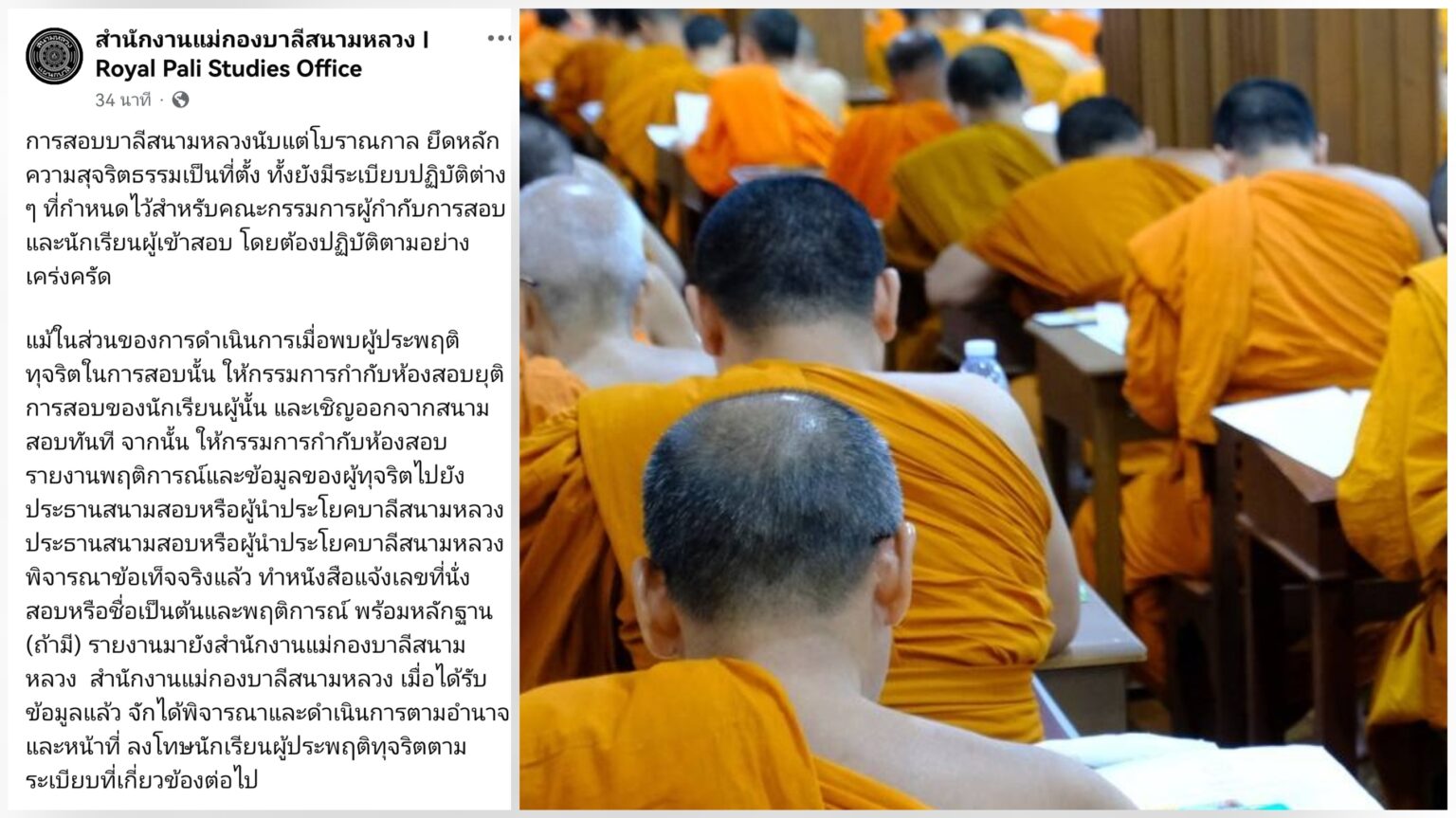 เมื่อวันที่ 27 ม.ค. สำนักงานแม่กองบาลีสนามหลวง ได้มีการโพสต์ผ่านเพจเฟซบุ๊ก สำนักงานแม่กองบาลีสนามหลวง ว่า การสอบบาลีสนามหลวงนับแต่โบราณกาล ยึดหลักความสุจริตธรรมเป็นที่ตั้ง ทั้งยังมีระเบียบปฏิบัติต่างๆ ที่กำหนดไว้สำหรับคณะกรรมการผู้กำกับการสอบ และนักเรียนผู้เข้าสอบ โดยต้องปฏิบัติตามอย่างเคร่งครัด