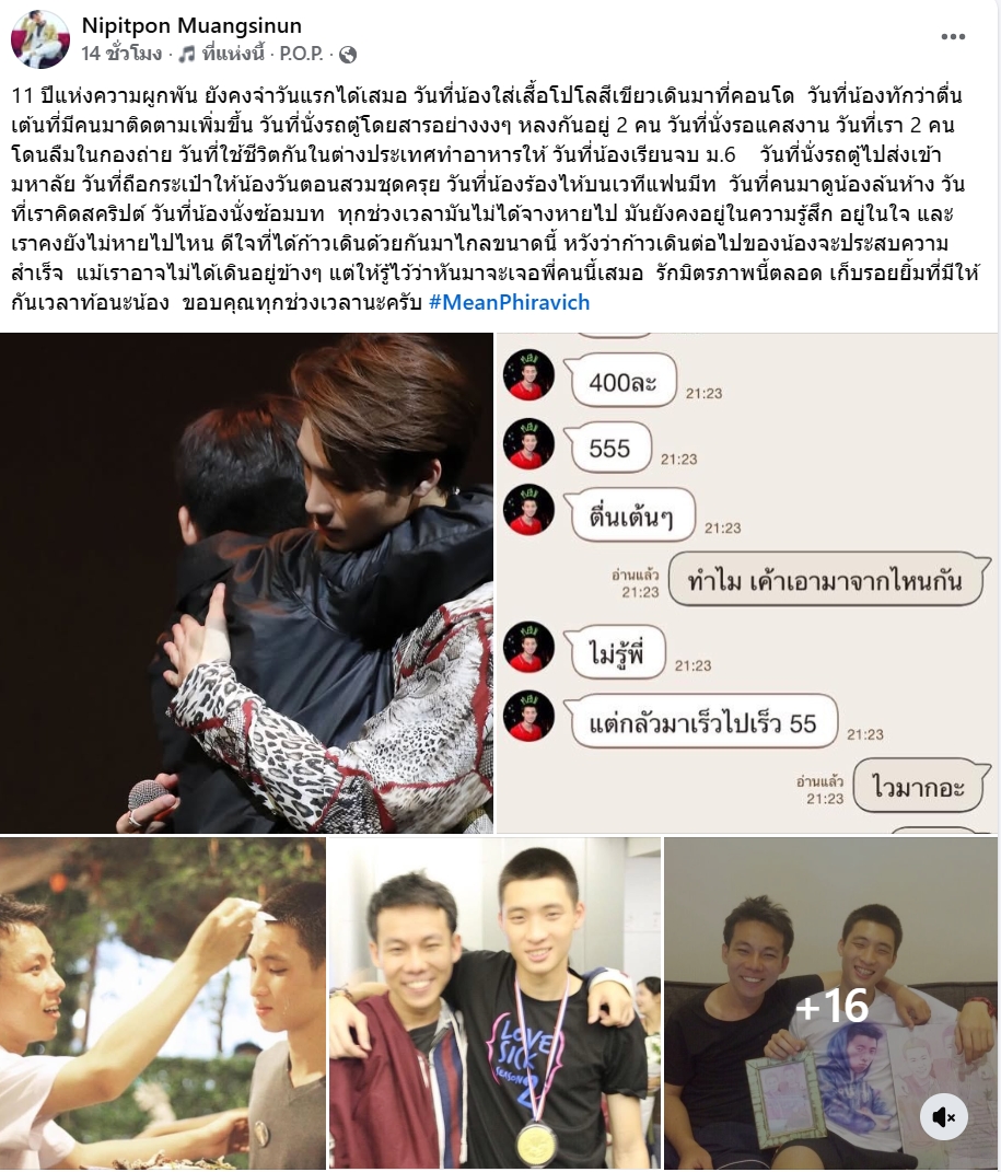 วันที่คนมาดูน้องล้นห้าง วันที่เราคิดสคริปต์ วันที่น้องนั่งซ้อมบท ทุกช่วงเวลามันไม่ได้จางหายไป มันยังคงอยู่ในความรู้สึก อยู่ในใจ และเราคงยังไม่หายไปไหน ดีใจที่ได้ก้าวเดินด้วยกันมาไกลขนาดนี้ หวังว่าก้าวเดินต่อไปของน้องจะประสบความสำเร็จ แม้เราอาจไม่ได้เดินอยู่ข้างๆ แต่ให้รู้ไว้ว่าหันมาจะเจอพี่คนนี้เสมอ รักมิตรภาพนี้ตลอด เก็บรอยยิ้มที่มีให้กันเวลาท้อนะน้อง ขอบคุณทุกช่วงเวลานะครับ #MeanPhiravich”