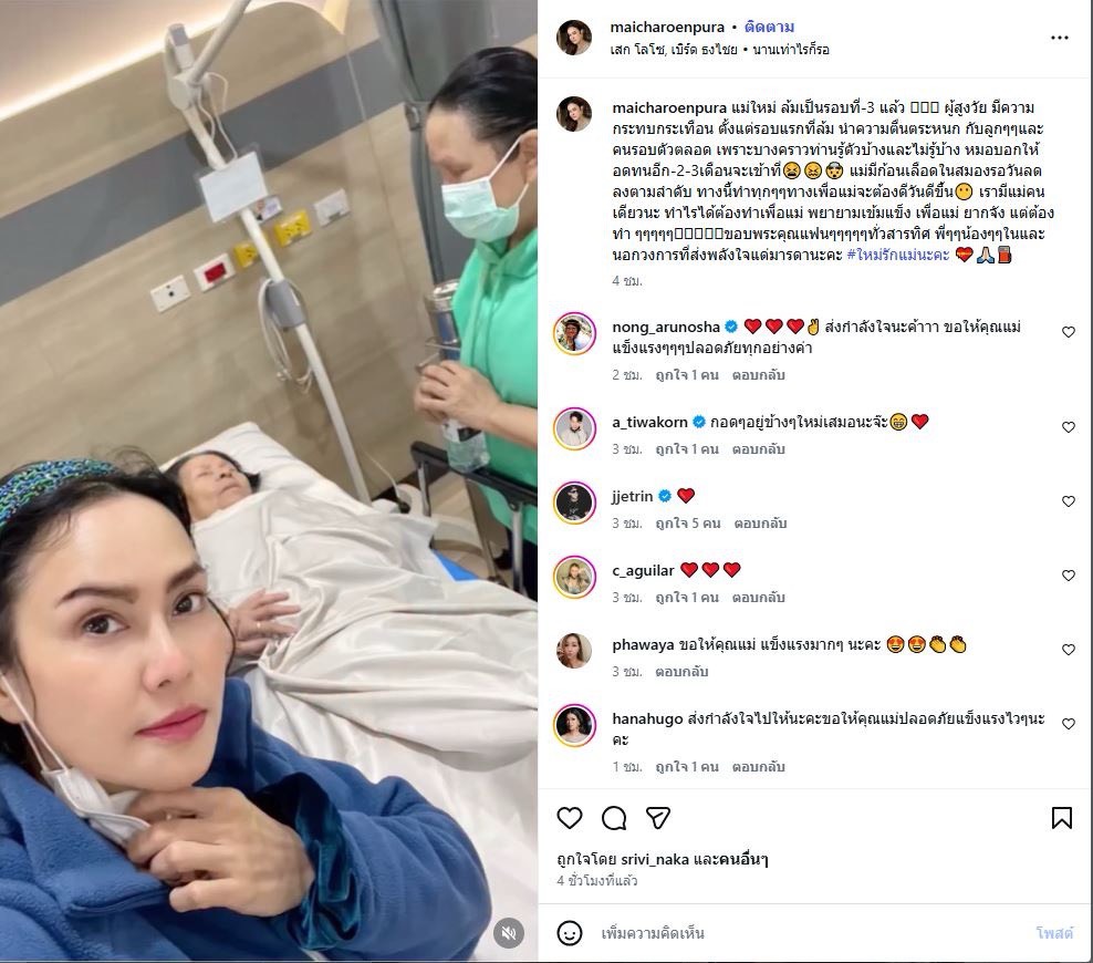 “แม่ใหม่ ล้มเป็นรอบที่-3 แล้ว ผู้สูงวัย มีความกระทบกระเทือน ตั้งแต่รอบแรกที่ล้ม นำความตื่นตระหนก กับลูกๆๆและคนรอบตัวตลอด เพราะบางคราวท่านรู้ตัวบ้างและไม่รู้บ้าง หมอบอกให้อดทนอีก-2-3เดือนจะเข้าที่ แม่มีก้อนเลือดในสมองรอวันลดลงตามลำดับ ทางนี้ทำทุกๆๆทางเพื่อแม่จะต้องดีวันดีขึ้น เรามีแม่คนเดียวนะ ทำไรได้ต้องทำเพื่อแม่ พยายามเข้มแข็ง เพื่อแม่ ยากจัง แต่ต้องทำ ๆๆๆๆๆขอบพระคุณแฟนๆๆๆๆๆทั่วสารทิศ พี่ๆๆน้องๆๆในและนอกวงการที่ส่งพลังใจแด่มารดานะคะ #ใหม่รักแม่นะคะ”