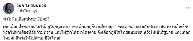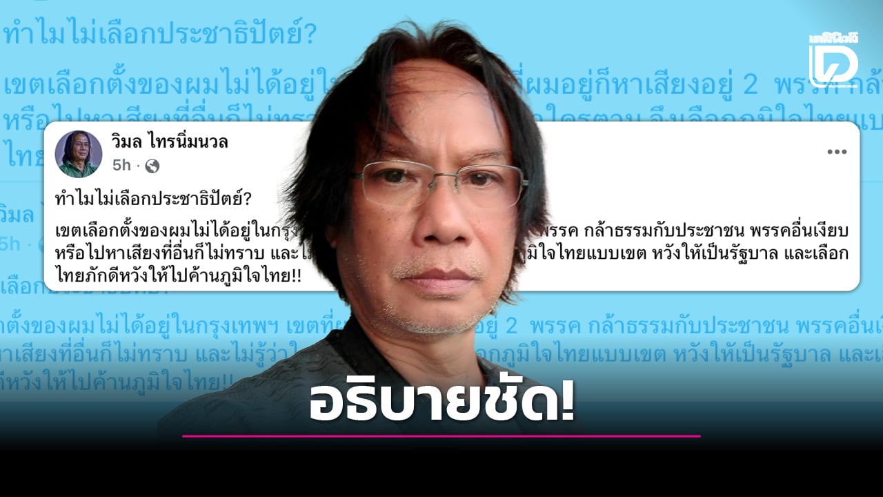 เมื่อวันที่ 7 ก.พ. 69 ผู้สื่อข่าวรายงานว่า “นายวิมล ไทรนิ่มนวล” นักเขียนรางวัลซีไรต์ชื่อดัง ได้ออกมาโพสต์ข้อความให้เหตุผลที่ไม่เลือกพรรคประชาธิปัตย์ ลงเฟซบุ๊ก “วิมล ไทรนิ่มนวล” ว่าเขตเลือกตั้งอยู่นอกกรุงเทพฯ และพบการหาเสียงเพียง 2 พรรค คือ พรรคกล้าธรรมและพรรคประชาชน ขณะที่พรรคอื่นไม่มีความเคลื่อนไหวชัดเจน จึงไม่ทราบว่าใครมีคะแนนนำหรือคะแนนตาม ส่งผลให้ตัดสินใจเลือกพรรคภูมิใจไทยแบบเขต เพื่อหวังให้เป็นรัฐบาล และเลือกพรรคไทยภักดี เพื่อหวังให้ไปค้านพรรคภูมิใจไทย