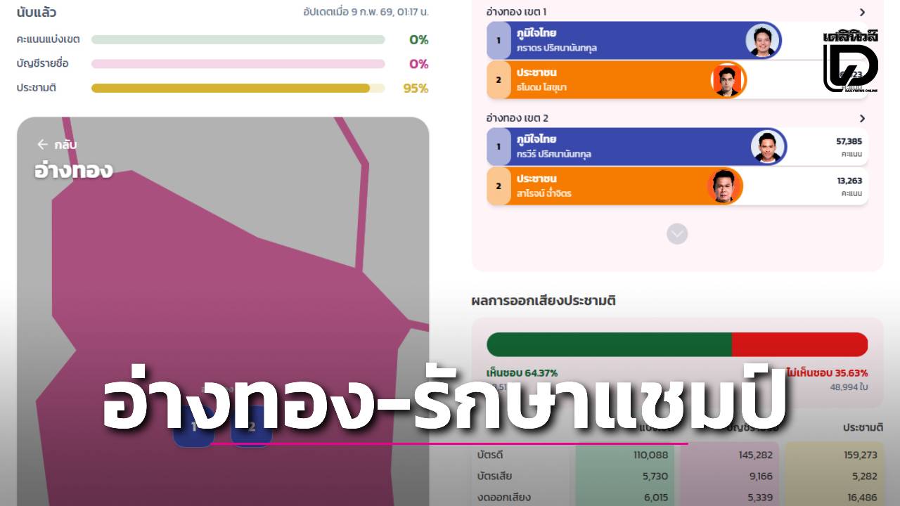 เมื่อวันที่ 9 ก.พ. ผู้สื่อข่าวรายงาน ผลการนับคะแนนเลือกตั้งสมาชิกสภาผู้แทนราษฎร (สส.) จังหวัดอ่างทอง 2 เขต อย่างไม่เป็นทางการเวลา 01.35 น. หรือนับคะแนนไปแล้วกว่า 72% ผลปรากฏว่า คะแนนอันดับ 1 ในแต่ละเขตมีดังต่อไปนี้