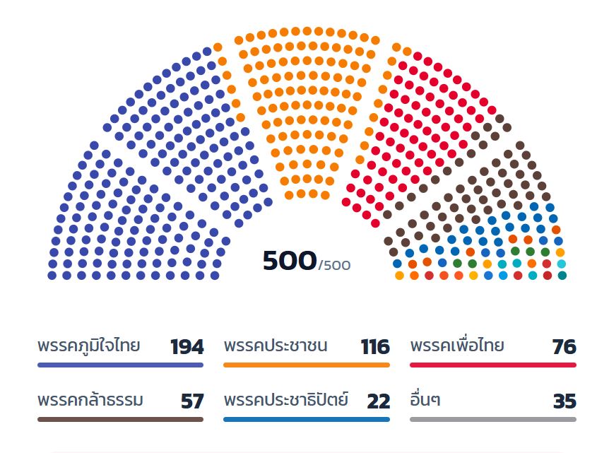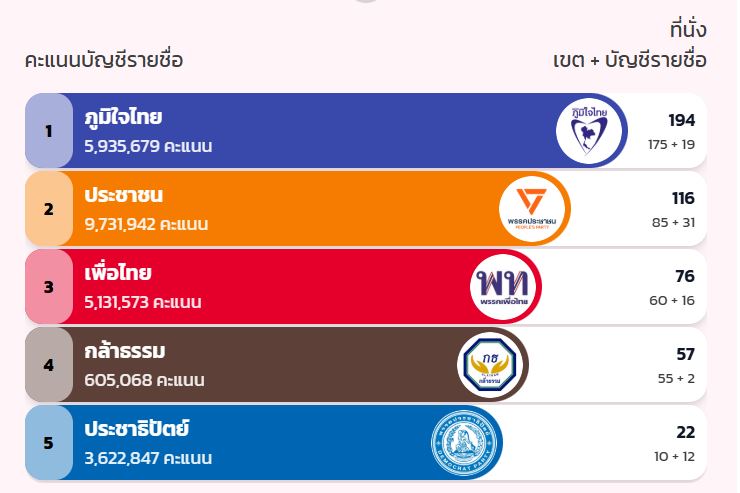 1.พรรคภูมิใจไทย 5,935,673 คะแนน 194 ที่นั่ง (175+19)