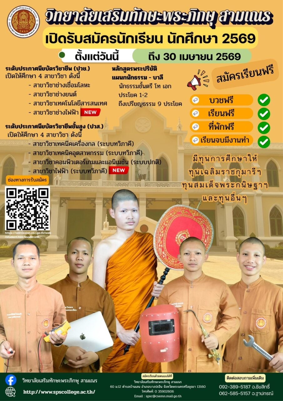 วิทยาลัยเสริมทักษะพระภิกษุ สามเณร เปิดรับสมัครนักเรียน นักศึกษา ตั้งแต่วันนี้ถึง 30 เม.ย.2569 บวชฟรี เรียนฟรี ที่พักฟรี เรียนจบมีงานทำ มีทุนการศึกษาให้ โดยขณะนี้ยังเปิดรับสมัครรอบโควตา รอบที่ 2 ถึงวันที่ 27 ก.พ. 2569 ด้วย