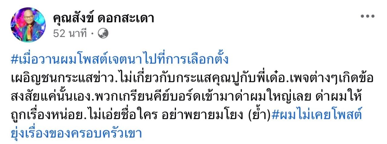 ล่าสุด “สังข์ ดอกสะเดา” ได้ออกมาโพสต์ข้อความชี้แจงอย่างชัดเจนเพื่อสยบข่าวลือและดัดหลังเกรียนคีย์บอร์ดที่เข้ามาถล่มด่า โดยระบุว่า “เมื่อวานผมโพสต์เจตนาไปที่การเลือกตั้ง เผอิญชนกระแสข่าว.ไม่เกี่ยวกับกระแสคุณปูกับพี่เด๋อ.เพจต่างๆเกิดข้อสงสัยแค่นั้นเอง.พวกเกรียนคีย์บอร์ดเข้ามาด่าผมใหญ่เลย ด่าผมให้ถูกเรื่องหน่อย.ไม่เอ่ยชื่อใคร อย่าพยายามโยง (ย้ำ)#ผมไม่เคยโพสต์ยุ่งเรื่องของครอบครัวเขา”