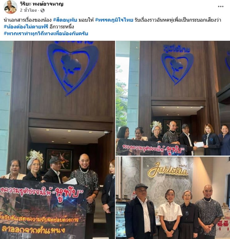 ทางด้านนักปั้นมือทอง “อุ๊บ วิริยะ” ก็ไม่ได้นิ่งนอนใจ เจ้าตัวโพสต์ภาพขณะหอบเอกสารหลักฐานสำคัญมุ่งหน้าไปยัง พรรคภูมิใจไทย เพื่อขอให้เป็นกระบอกเสียงในสภา โดยระบุข้อความสุดสะเทือนใจผ่านเฟซบุ๊กว่า “นำเอกสารเรื่องของน้อง #สีดอหูพับ มอบให้ #พรรคภูมิใจไทย รับเรื่องราวอันหดหู่เพื่อเป็นกระบอกเสียงว่า #น้องต้องไม่ตายฟรี อีกวาระหนึ่ง #พวกเราทำทุกวิถีทางเพื่อน้องกันครับ”