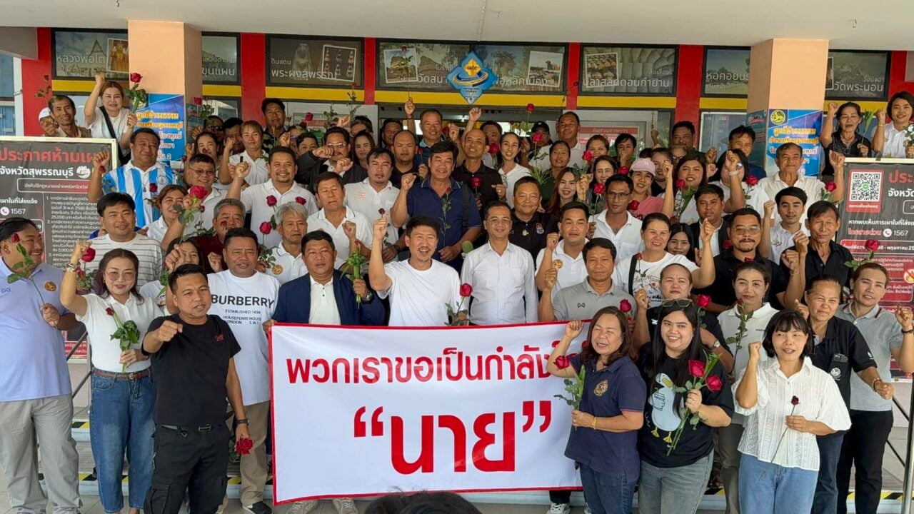 เมื่อวันที่ 13 ก.พ. นายสราวุธ จำปาเงิน กำนันตำบลตลิ่งชัน ประธานชมรมกำนันผู้ใหญ่บ้าน อ.เมืองสุพรรณบุรี และรองนายกสมาคมกำนันผู้ใหญ่บ้าน จ.สุพรรณบุรี พร้อมด้วยกำนันผู้ใหญ่บ้านในพื้นที่ กรรมการประจำหน่วยเลือกตั้งในพื้นที่ เขต 1 (กปน.) และชาวบ้านประมาณ 100 คน เดินทางไปที่ทำการอำเภอเมืองสุพรรณบุรี เพื่อมอบดอกกุหลาบแดงให้กำลังใจ นายสิทธิพร คงหอม นายอำเภอเมืองสุพรรณบุรี
