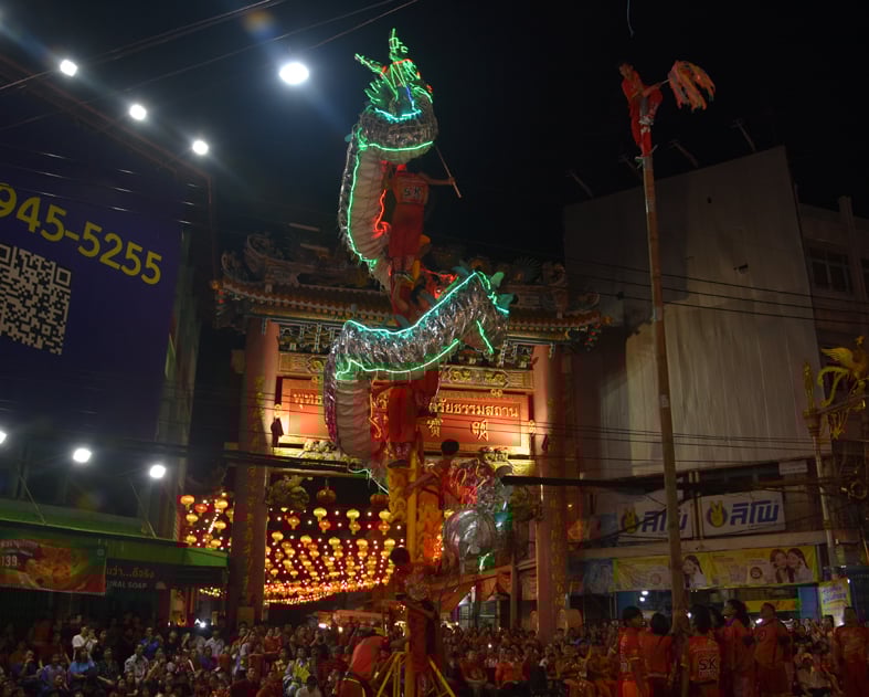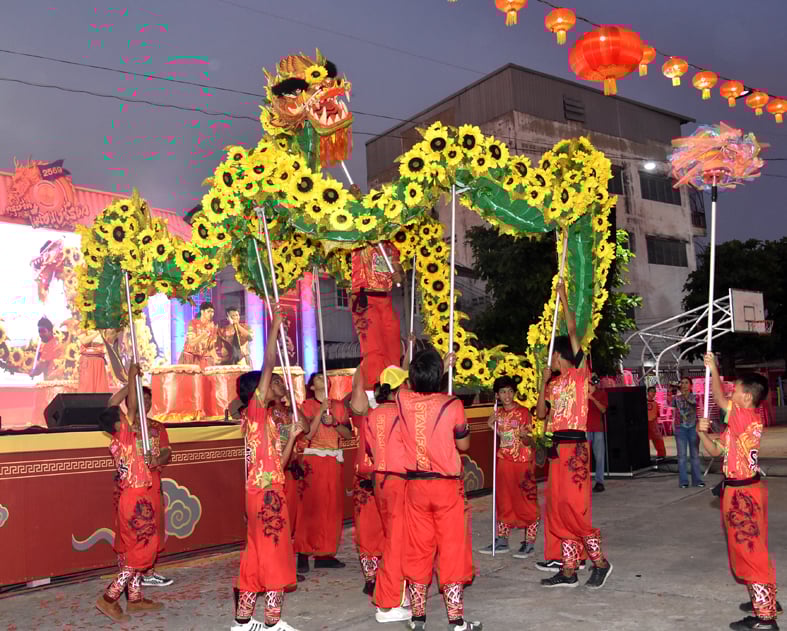 โดยบรรยากาศภายในงานเต็มไปด้วยรอยยิ้มและความสดใสของพี่น้องชาวสระบุรีที่พร้อมใจกันแต่งกายด้วยชุดกี่เพ้าและเสื้อผ้าโทนสีแดงมงคล โดยพิธีเปิดสำคัญอยู่ที่ตอนประธานตีกลองมหามงคลเพื่อเปิดงาน ก่อนจะร่วมรับชมการแสดง “มังกรดอกทานตะวันอวยพร” ซึ่งเป็นเอกลักษณ์หนึ่งเดียวของสระบุรี และการเชิดสิงโต-มังกรสุดตื่นเต้น ณ บริเวณสี่แยกยาไทย ท่ามกลางชาวเทศบาลเมืองสระบุรี และนักท่องเที่ยวที่ร่วมชมอย่างเนืองแน่น