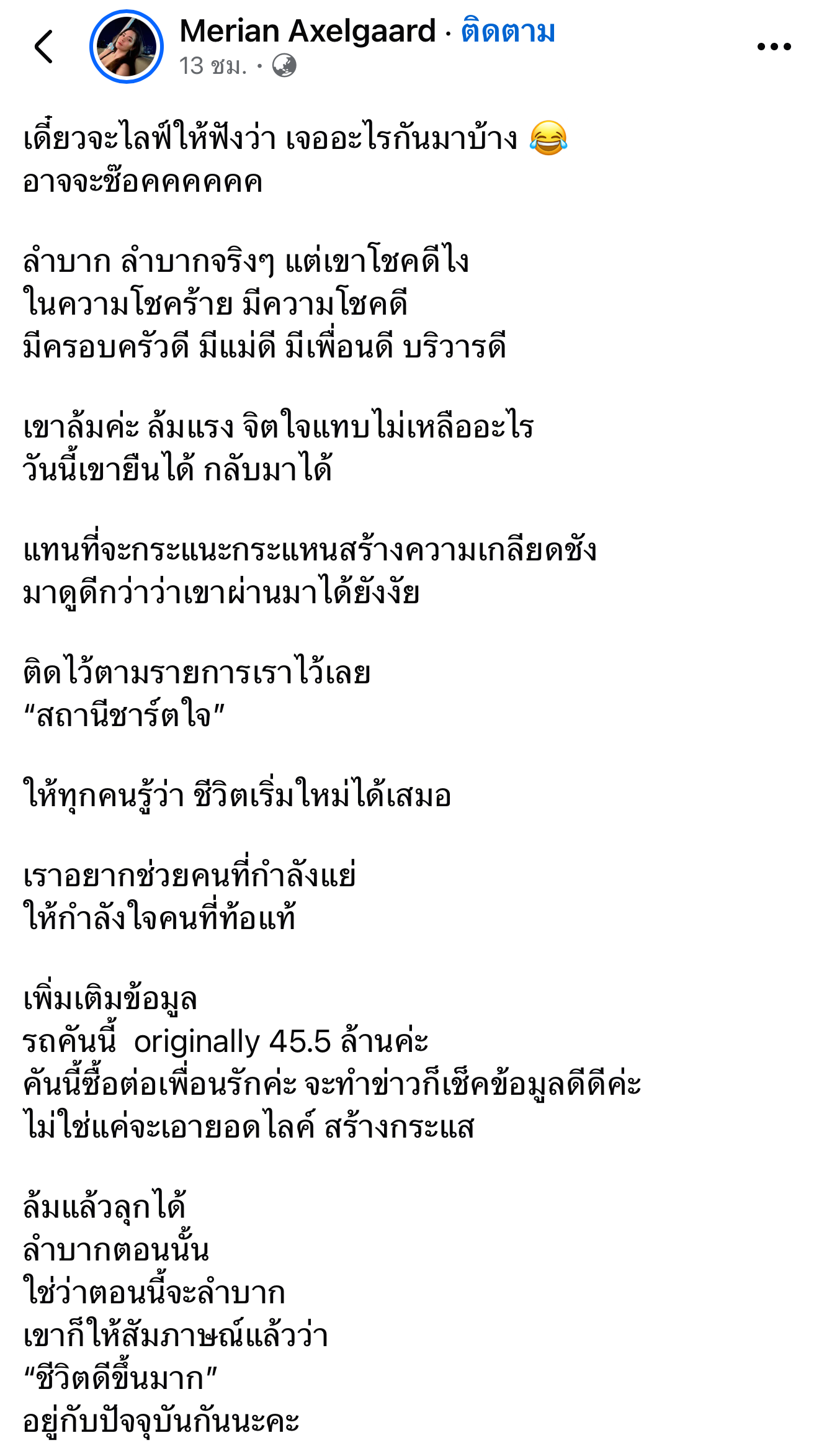 ด้าน “มีเรียน” แฟนสาวคนสวย ไม่ปล่อยให้คนรักโดนโจมตีฝ่ายเดียว ออกมาโพสต์ข้อความร่ายยาวผ่านโซเชียลเตรียมไลฟ์สดเผยเบื้องหลังที่อาจจะทำให้ทุกคนต้องช็อก โดยระบุว่า “เดี๋ยวจะไลฟ์ให้ฟังว่า เจออะไรกันมาบ้าง & อาจจะช็อก ลำบาก ลำบากจริงๆ แต่เขาโชคดีไงในความโชคร้าย มีความโชคดีมีครอบครัวดี มีแม่ดี มีเพื่อนดี บริวารดี เขาล้มค่ะ ล้มแรง จิตใจแทบไม่เหลืออะไร วันนี้เขายืนได้ กลับมาได้ แทนที่จะกระแนะกระแหนสร้างความเกลียดชัง มาดูดีกว่าว่าเขาผ่านมาได้ยังไง ติดไว้ตามรายการเราไว้เลย “สถานีชาร์ตใจ” ให้ทุกคนรู้ว่า ชีวิตเริ่มใหม่ได้เสมอ เราอยากช่วยคนที่กำลังแย่ให้กำลังใจคนที่ท้อแท้ เพิ่มเติมข้อมูล รถคันนี้ originally 45.5 ล้านค่ะ