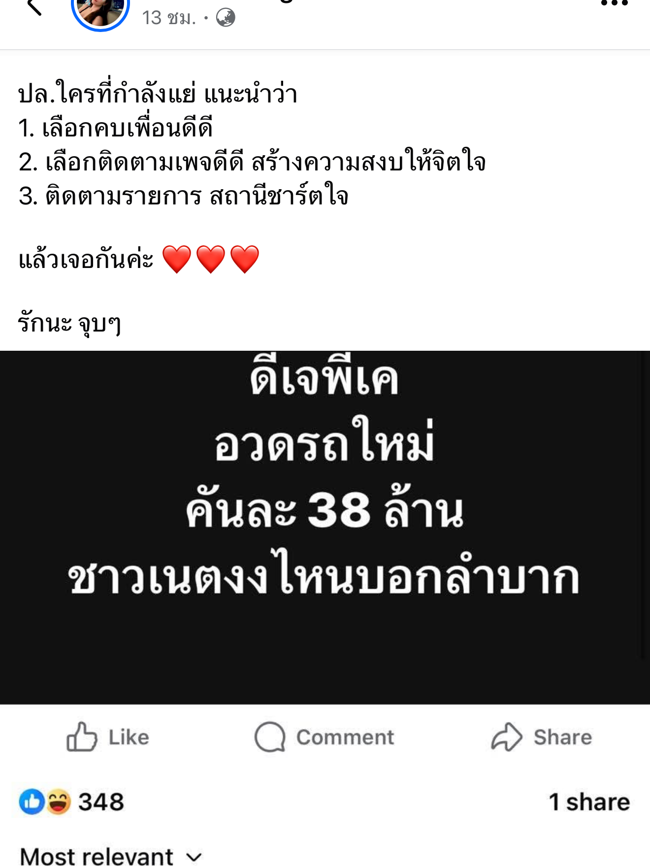 คันนี้ซื้อต่อเพื่อนรักค่ะ จะทำข่าวก็เช็กข้อมูลดีๆ ค่ะ ไม่ใช่แค่จะเอายอดไลก์ สร้างกระแส ล้มแล้วลุกได้ ลำบากตอนนั้น ใช่ว่าตอนนี้จะลำบาก เขาก็ให้สัมภาษณ์แล้วว่า “ชีวิตดีขึ้นมาก” อยู่กับปัจจุบันกันนะคะ ป.ล.ใครที่กำลังแย่ แนะนำว่า 1.เลือกคบเพื่อนดีดี 2.เลือกติดตามเพจดีๆ สร้างความสงบให้จิตใจ 3.ติดตามรายการ สถานีชาร์ตใจแล้วเจอกันค่ะ รักนะ จุ๊บๆ“
