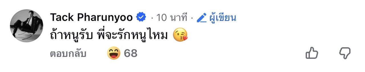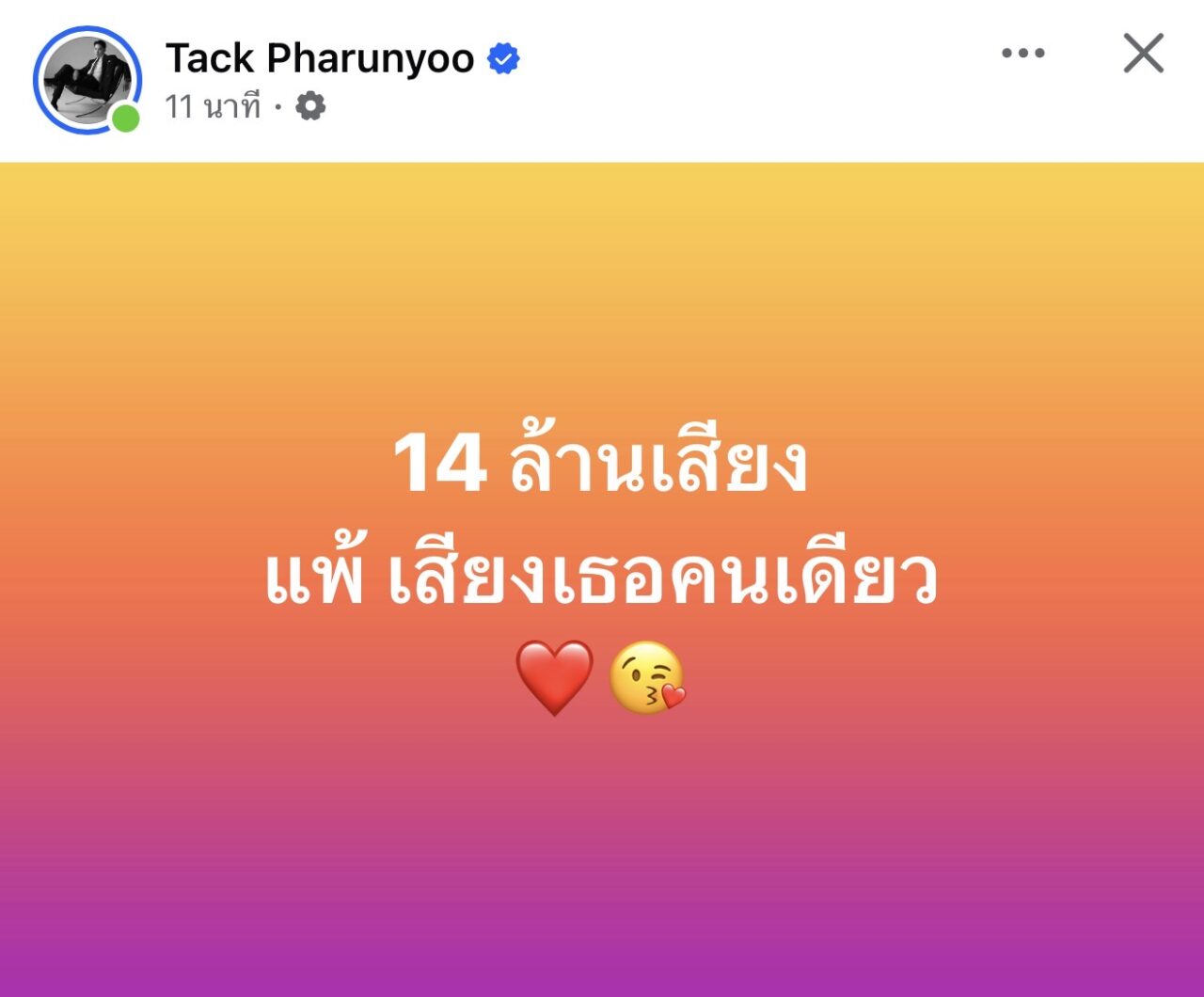 ล่าสุดนักแสดงหนุ่มอารมณ์ดีผู้เกาะติดทุกกระแสสังคมอย่าง “แทค-ภรัณยู โรจนวุฒิธรรม” ก็ได้ออกมาเคลื่อนไหวเกี่ยวกับประเด็นดังกล่าวผ่านเฟซบุ๊กส่วนตัว ซึ่งทำเอาชาวเน็ตถึงกับซี้ดปากในความช่างคิดช่างโพสต์ โดยหนุ่มแทคระบุข้อความสั้นๆ ว่า “14 ล้านเสียง แพ้ เสียงเธอคนเดียว” ไม่เพียงเท่านั้น หนุ่มแทคยังหยิบยกวลีเด็ดจากรายการชื่อดังของสาวก้อย มาเขียนต่อในช่องแสดงความคิดเห็นว่า “ถ้าหนูรับ พี่จะรักหนูไหม”
