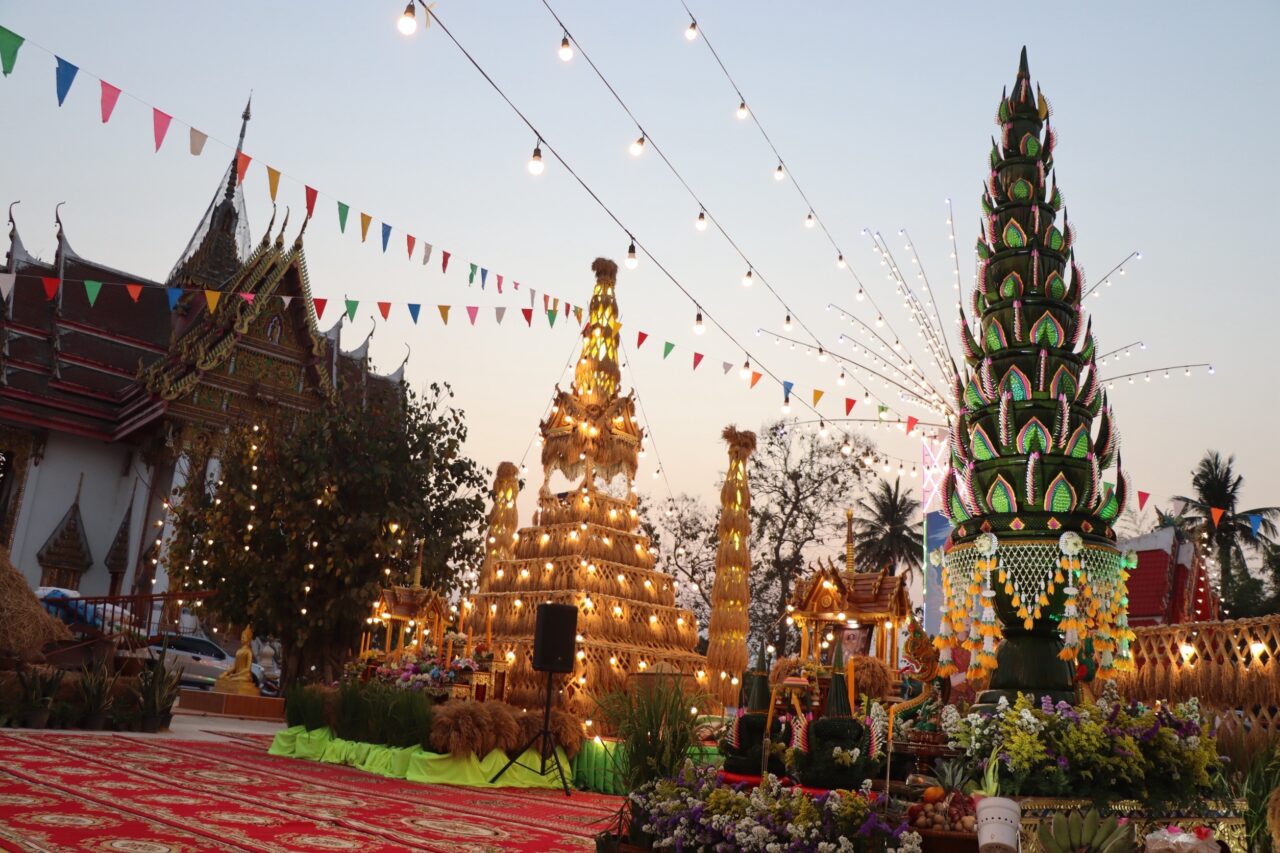 สำหรับบรรยากาศการจัดงานเริ่มขึ้นตั้งแต่เวลา 18.00 น. เป็นต้นไป ประกอบด้วยพิธีเจริญพระพุทธมนต์และการประพรมน้ำพระพุทธมนต์กองข้าวที่ชาวบ้านเตรียมไว้เป็นเมล็ดพันธุ์สำหรับฤดูกาลผลิตใหม่ โดยทางวัดได้เชิญหมอทำขวัญชื่อเสียงโด่งดังมาประกอบพิธีทำขวัญข้าวและบายศรีรอบกองข้าวท่ามกลางเกษตรกรและชาวบ้านที่มาร่วมงานกันอย่างคับคั่ง เพื่อรับพลังสิริมงคลหลังเสร็จสิ้นฤดูเก็บเกี่ยว